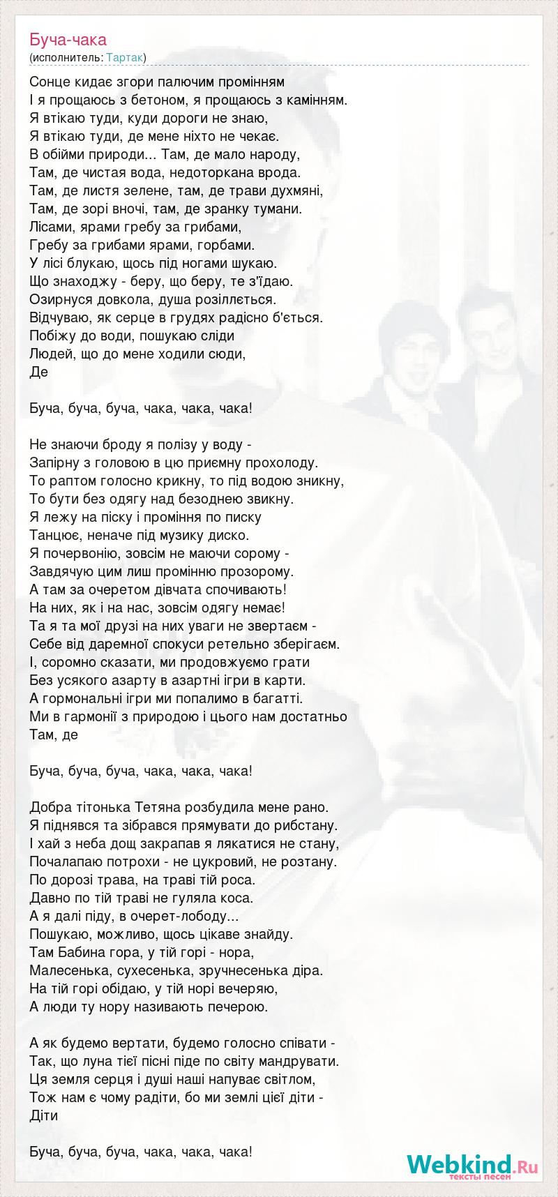 Сонце кидає згори палючим промінням І я прощаюсь з бетоном, я прощаюсь з камінням. Я втікаю туди, куди дороги не знаю, Я втікаю туди, де мене ніхто не чекає. В обійми природи... Там, де мало народу, Там, де чистая вода, недоторкана врода. Там, де листя зелене, там, де трави духмяні, Там, де зорі вночі, там, де зранку тумани. Лісами, ярами гребу за грибами, Гребу за грибами ярами, горбами. У лісі блукаю, щось під ногами шукаю. Що знаходжу - беру, що беру, те з'їдаю. Озирнуся довкола, душа розіллється. Відчуваю, як серце в грудях радісно б'ється. Побіжу до води, пошукаю сліди Людей, що до мене ходили сюди, Де Буча, буча, буча, чака, чака, чака! Не знаючи броду я полізу у воду - Запірну з головою в цю приємну прохолоду. То раптом голосно крикну, то під водою зникну, То бути без одягу над безоднею звикну. Я лежу на піску і проміння по писку Танцює, неначе під музику диско. Я почервонію, зовсім не маючи сорому - Завдячую цим лиш промінню прозорому. А там за очеретом дівчата спочивають! На них, як і на нас, зовсім одягу немає! Та я та мої друзі на них уваги не звертаєм - Себе від даремної спокуси ретельно зберігаєм. І, соромно сказати, ми продовжуємо грати Без усякого азарту в азартні ігри в карти. А гормональні ігри ми попалимо в багатті. Ми в гармонії з природою і цього нам достатньо Там, де Буча, буча, буча, чака, чака, чака! Добра тітонька Тетяна розбудила мене рано. Я піднявся та зібрався прямувати до рибстану. І хай з неба дощ закрапав я лякатися не стану, Почалапаю потрохи - не цукровий, не розтану. По дорозі трава, на траві тій роса. Давно по тій траві не гуляла коса. А я далі піду, в очерет-лободу... Пошукаю, можливо, щось цікаве знайду. Там Бабина гора, у тій горі - нора, Малесенька, сухесенька, зручнесенька діра. На тій горі обідаю, у тій норі вечеряю, А люди ту нору називають печерою. А як будемо вертати, будемо голосно співати - Так, що луна тієї пісні піде по світу мандрувати. Ця земля серця і душі наші напуває світлом, Тож нам є чому радіти, бо ми землі цієї діти - Діти Буча, буча, буча, чака, чака, чака!