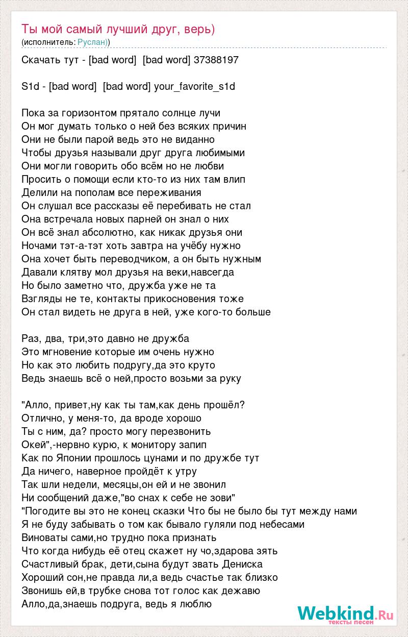 Скачать тут - [bad word] [bad word] 37388197 S1d - [bad word] [bad word] your_favorite_s1d Пока за горизонтом прятало солнце лучи Он мог думать только о ней без всяких причин Они не были парой ведь это не виданно Чтобы друзья называли друг друга любимыми Они могли говорить обо всём но не любви Просить о помощи если кто-то из них там влип Делили на пополам все переживания Он слушал все рассказы её перебивать не стал Она встречала новых парней он знал о них Он всё знал абсолютно, как никак друзья они Ночами тэт-а-тэт хоть завтра на учёбу нужно Она хочет быть переводчиком, а он быть нужным Давали клятву мол друзья на веки,навсегда Но было заметно что, дружба уже не та Взгляды не те, контакты прикосновения тоже Он стал видеть не друга в ней, уже кого-то больше Раз, два, три,это давно не дружба Это мгновение которые им очень нужно Но как это любить подругу,да это круто Ведь знаешь всё о ней,просто возьми за руку "Алло, привет,ну как ты там,как день прошёл? Отлично, у меня-то, да вроде хорошо Ты с ним, да? просто могу перезвонить Окей",-нервно курю, к монитору запип Как по Японии прошлось цунами и по дружбе тут Да ничего, наверное пройдёт к утру Так шли недели, месяцы,он ей и не звонил Ни сообщений даже,"во снах к себе не зови" "Погодите вы это не конец сказки Что бы не было бы тут между нами Я не буду забывать о том как бывало гуляли под небесами Виноваты сами,но трудно пока признать Что когда нибудь её отец скажет ну чо,здарова зять Счастливый брак, дети,сына будут звать Дениска Хороший сон,не правда ли,а ведь счастье так близко Звонишь ей,в трубке снова тот голос как дежавю Алло,да,знаешь подруга, ведь я люблю
