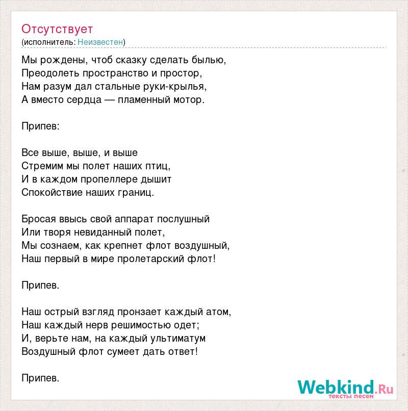Мы рождены, чтоб сказку сделать былью, Преодолеть пространство и простор, Нам разум дал стальные руки-крылья, А вместо сердца — пламенный мотор. Припев: Все выше, выше, и выше Стремим мы полет наших птиц, И в каждом пропеллере дышит Спокойствие наших границ. Бросая ввысь свой аппарат послушный Или творя невиданный полет, Мы сознаем, как крепнет флот воздушный, Наш первый в мире пролетарский флот! Припев. Наш острый взгляд пронзает каждый атом, Наш каждый нерв решимостью одет; И, верьте нам, на каждый ультиматум Воздушный флот сумеет дать ответ! Припев.