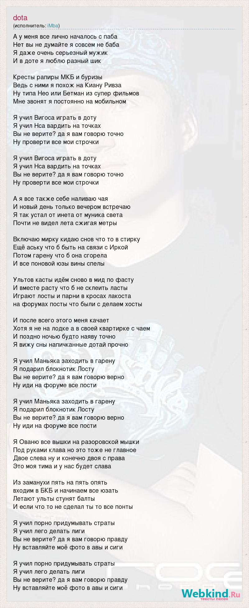 А у меня все лично началось с паба Нет вы не думайте я совсем не баба Я даже очень серьезный мужик И в доте я люблю разный шик Кресты рапиры МКБ и буризы Ведь с ними я похож на Киану Ривза Ну типа Нео или Бетман из супер фильмов Мне звонят я постоянно на мобильном Я учил Вигоса играть в доту Я учил Нса вардить на точках Вы не верите? да я вам говорю точно Ну проверти все мои строчки Я учил Вигоса играть в доту Я учил Нса вардить на точках Вы не верите? да я вам говорю точно Ну проверти все мои строчки А я все также себе наливаю чая И новый день только вечером встречаю Я так устал от инета от муника света Почти не видел лета сжигая метры Включаю мирку кидаю снов что то в стирку Ещё аську что б быть на связи с Иркой Потом гарену что б она сгорела И все поновой юзы вины спелы Ультов касты идём сново в мид по фасту И вместе расту что б не склеить ласты Играют лосты и парни в кросах лакоста на форумах посты что были с делаем хосты И после всего этого меня качает Хотя я не на лодке а в своей квартирке с чаем И поздно ночью будто наяву точно Я вижу сны напичканные дотай прочно Я учил Маньяка заходить в гарену Я подарил блокнотик Лосту Вы не верите? да я вам говорю верно Ну иди на форуме все пости Я учил Маньяка заходить в гарену Я подарил блокнотик Лосту Вы не верите? да я вам говорю верно Ну иди на форуме все пости Я Ованю все вышки на разоровской мышки Под руками клава но это тоже не главное Двое слева ну и конечно двоя с права Это моя тима и у нас будет слава Из заманухи пять на пять опять входим в БКБ и начинаем все юзать Летают ульты стунят балты И если что то не сделал ты то все понты Я учил порно придумывать страты Я учил лего делать лиги Вы не верите? да я вам говорю правду Ну вставляйте моё фото в авы и сиги Я учил порно придумывать страты Я учил лего делать лиги Вы не верите? да я вам говорю правду Ну вставляйте моё фото в авы и сиги