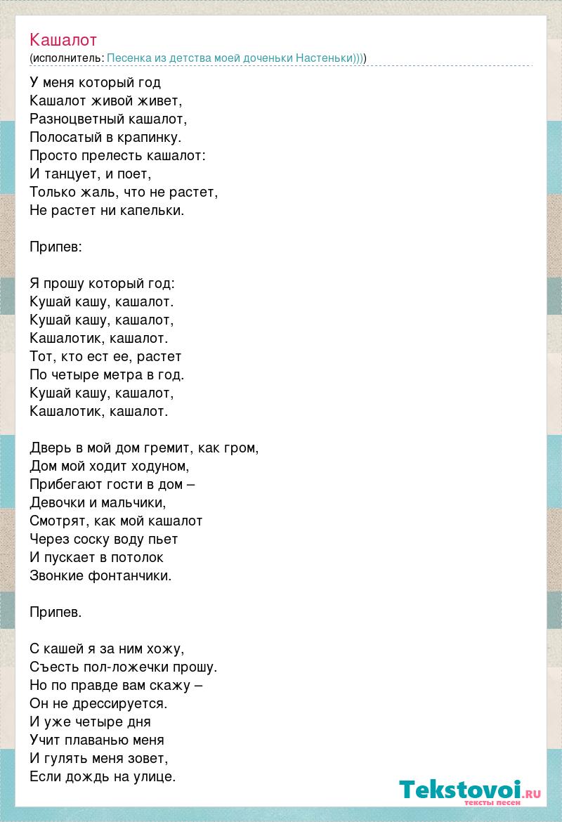 У меня который год Кашалот живой живет, Разноцветный кашалот, Полосатый в крапинку. Просто прелесть кашалот: И танцует, и поет, Только жаль, что не растет, Не растет ни капельки. Припев: Я прошу который год: Кушай кашу, кашалот. Кушай кашу, кашалот, Кашалотик, кашалот. Тот, кто ест ее, растет По четыре метра в год. Кушай кашу, кашалот, Кашалотик, кашалот. Дверь в мой дом гремит, как гром, Дом мой ходит ходуном, Прибегают гости в дом – Девочки и мальчики, Смотрят, как мой кашалот Через соску воду пьет И пускает в потолок Звонкие фонтанчики. Припев. С кашей я за ним хожу, Съесть пол-ложечки прошу. Но по правде вам скажу – Он не дрессируется. И уже четыре дня Учит плаванью меня И гулять меня зовет, Если дождь на улице.