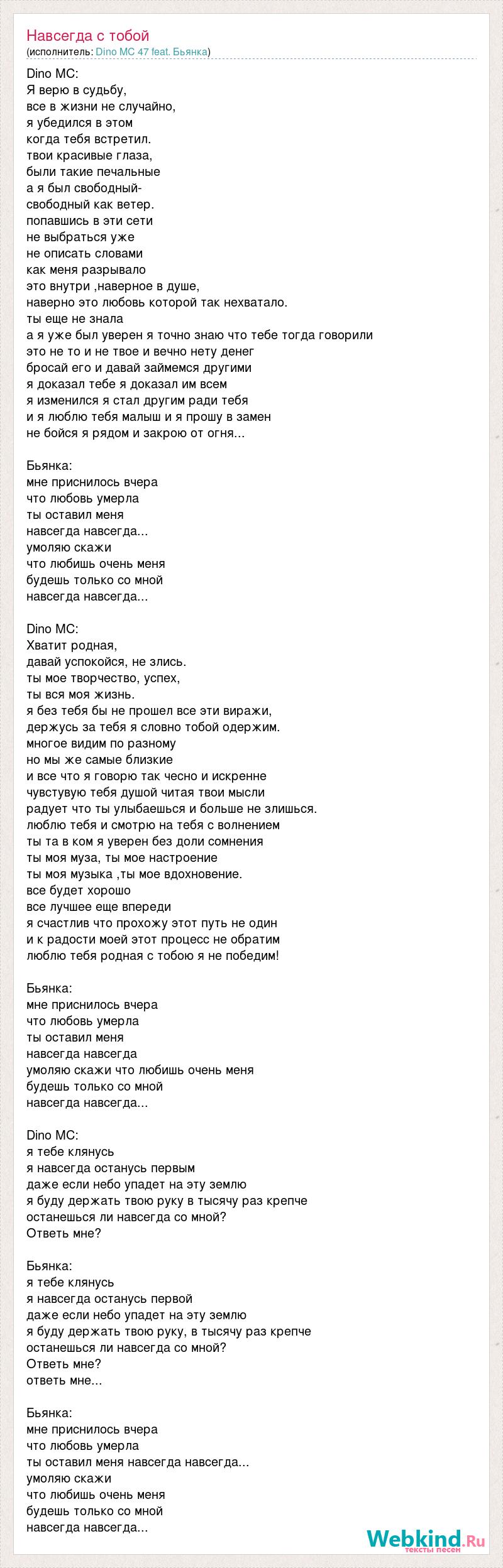 Dino МС: Я верю в судьбу, все в жизни не случайно, я убедился в этом когда тебя встретил. твои красивые глаза, были такие печальные а я был свободный- свободный как ветер. попавшись в эти сети не выбраться уже не описать словами как меня разрывало это внутри ,наверное в душе, наверно это любовь которой так нехватало. ты еще не знала а я уже был уверен я точно знаю что тебе тогда говорили это не то и не твое и вечно нету денег бросай его и давай займемся другими я доказал тебе я доказал им всем я изменился я стал другим ради тебя и я люблю тебя малыш и я прошу в замен не бойся я рядом и закрою от огня... Бьянка: мне приснилось вчера что любовь умерла ты оставил меня навсегда навсегдa... умоляю скажи что любишь очень меня будешь только со мной навсегда навсегда... Dino МС: Хватит родная, давай успокойся, не злись. ты мое творчество, успех, ты вся моя жизнь. я без тебя бы не прошел все эти виражи, держусь за тебя я словно тобой одержим. многое видим по разному но мы же самые близкие и все что я говорю так чесно и искренне чувстувую тебя душой читая твои мысли радует что ты улыбаешься и больше не злишься. люблю тебя и смотрю на тебя с волнением ты та в ком я уверен без доли сомнения ты моя муза, ты мое настроение ты моя музыка ,ты мое вдохновение. все будет хорошо все лучшее еще впереди я счастлив что прохожу этот путь не один и к радости моей этот процесс не обратим люблю тебя родная с тобою я не победим! Бьянка: мне приснилось вчера что любовь умерла ты оставил меня навсегда навсегда умоляю скажи что любишь очень меня будешь только со мной навсегда навсегда... Dino МС: я тебе клянусь я навсегда останусь первым даже если небо упадет на эту землю я буду держать твою руку в тысячу раз крепче останешься ли навсегда со мной? Ответь мне? Бьянка: я тебе клянусь я навсегда останусь первой даже если небо упадет на эту землю я буду держать твою руку, в тысячу раз крепче останешься ли навсегда со мной? Ответь мне? ответь мне... Бьянка: мне приснилось вчера что любовь умерла ты оставил меня навсегда навсегда... умоляю скажи что любишь очень меня будешь только со мной навсегда навсегда...