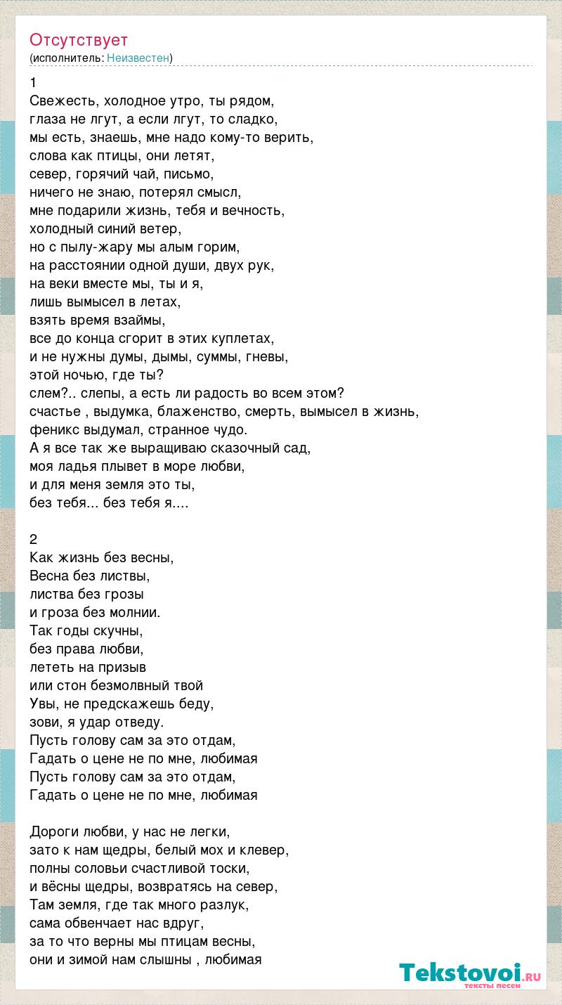 1 Свежесть, холодное утро, ты рядом, глаза не лгут, а если лгут, то сладко, мы есть, знаешь, мне надо кому-то верить, слова как птицы, они летят, север, горячий чай, письмо, ничего не знаю, потерял смысл, мне подарили жизнь, тебя и вечность, холодный синий ветер, но с пылу-жару мы алым горим, на расстоянии одной души, двух рук, на веки вместе мы, ты и я, лишь вымысел в летах, взять время взаймы, все до конца сгорит в этих куплетах, и не нужны думы, дымы, суммы, гневы, этой ночью, где ты? слем?.. слепы, а есть ли радость во всем этом? счастье , выдумка, блаженство, смерть, вымысел в жизнь, феникс выдумал, странное чудо. А я все так же выращиваю сказочный сад, моя ладья плывет в море любви, и для меня земля это ты, без тебя... без тебя я.... 2 Как жизнь без весны, Весна без листвы, листва без грозы и гроза без молнии. Так годы скучны, без права любви, лететь на призыв или стон безмолвный твой Увы, не предскажешь беду, зови, я удар отведу. Пусть голову сам за это отдам, Гадать о цене не по мне, любимая Пусть голову сам за это отдам, Гадать о цене не по мне, любимая Дороги любви, у нас не легки, зато к нам щедры, белый мох и клевер, полны соловьи счастливой тоски, и вёсны щедры, возвратясь на север, Там земля, где так много разлук, сама обвенчает нас вдруг, за то что верны мы птицам весны, они и зимой нам слышны , любимая