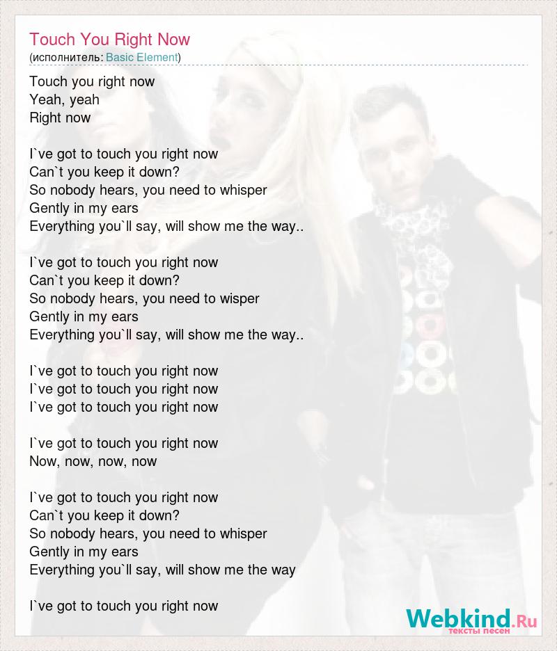 Touch you right now Yeah, yeah Right now I`ve got to touch you right now Can`t you keep it down? So nobody hears, you need to whisper Gently in my ears Everything you`ll say, will show me the way.. I`ve got to touch you right now Can`t you keep it down? So nobody hears, you need to wisper Gently in my ears Everything you`ll say, will show me the way.. I`ve got to touch you right now I`ve got to touch you right now I`ve got to touch you right now I`ve got to touch you right now Now, now, now, now I`ve got to touch you right now Can`t you keep it down? So nobody hears, you need to whisper Gently in my ears Everything you`ll say, will show me the way I`ve got to touch you right now