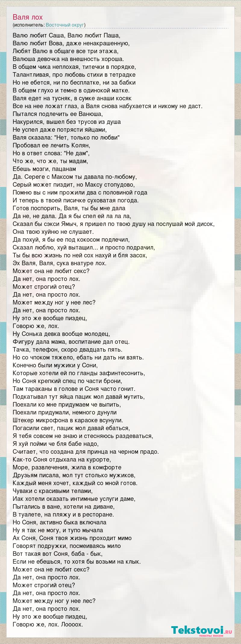 Валю любит Саша, Валю любит Паша, Валю любит Вова, даже ненакрашенную, Любят Валю в общаге все три этажа, Валюша девочка на внешность хороша. В общем чика неплохая, титечки в порядке, Талантливая, про любовь стихи в тетрадке Но не ебется, ни по бесплатке, ни за бабки В общем глухо и темно в одинокой матке. Валя едет на тусняк, в сумке анаши косяк Все на нее ложат глаз, а Валя снова набухается и никому не даст. Пытался подлечить ее Ванюша, Накурился, вышел без трусов из душа Не успел даже потрясти яйцами, Валя сказала: "Нет, только по любви" Пробовал ее лечить Колян, Но в ответ слова: "Не дам", Что же, что же, ты мадам, Ебешь мозги, пацанам Да. Сереге с Максом ты давала по-любому, Серый может пиздит, но Максу стопудово, Помню вы с ним прожили два с половиной года И теперь в твоей писичке суховатая погода. Готов поспорить, Валя, ты бы мне дала Да не, не дала. Да я бы спел ей ла ла ла, Сказал бы сэкси Ямыч, я пришел по твою душу на послушай мой дисок, Она твою хуйню не слушает. Да похуй, я бы ее под кокосом подлечил, Сказал люблю, хуй вытащил... и просто подрачил, Ты бы всю жизнь по ней сох нахуй и бля засох, Эх Валя, Валя, сука внатуре лох. Может она не любит секс? Да нет, она просто лох. Может строгий отец? Да нет, она просто лох. Может между ног у нее лес? Да нет, она просто лох. Ну это же вообще пиздец, Говорю же, лох. Ну Сонька девка вообще молодец, Фигуру дала мама, воспитание дал отец. Тачка, телефон, скоро двадцать пять. Но со чпоком тяжело, ебать ни дать ни взять. Конечно были мужики у Сони, Которые хотели ей по гланды зафинтесонить, Но Соня крепкий спец по части брони, Там тараканы в голове и Соня часто гонит. Подкатывал тут яйца пацик мол давай мутить, Поехали ко мне придумаем че выпить, Поехали придумали, немного дунули Штекер микрофона в караоке всунули. Погасили свет, пацик мол давай ебаться, Я тебя совсем не знаю и стесняюсь раздеваться, Я хуй пойми че бля бабе надо, Считает, что создана для принца на черном прадо. Как-то Соня отдыхала на курорте, Море, развлечения, жила в комфорте Друзьям писала, мол тут столько мужиков, Каждый меня хочет, каждый со мной готов. Чуваки с красивыми телами, Иак хотели оказать интимные услуги даме, Пытались в ване, хотели на диване, В туалете, на пляжу и в ресторане. Но Соня, активно быка включала Ну я так не могу, и тупо мычала Ах Соня, Соня твоя жизнь проходит мимо Говорят подружки, посмеиваясь мило Вот такая вот Соня, баба - бык, Если не ебешься, то хотя бы возьми на клык. Может она не любит секс? Да нет, она просто лох. Может строгий отец? Да нет, она просто лох. Может между ног у нее лес? Да нет, она просто лох. Ну это же вообще пиздец, Говорю же, лох. Лоооох.