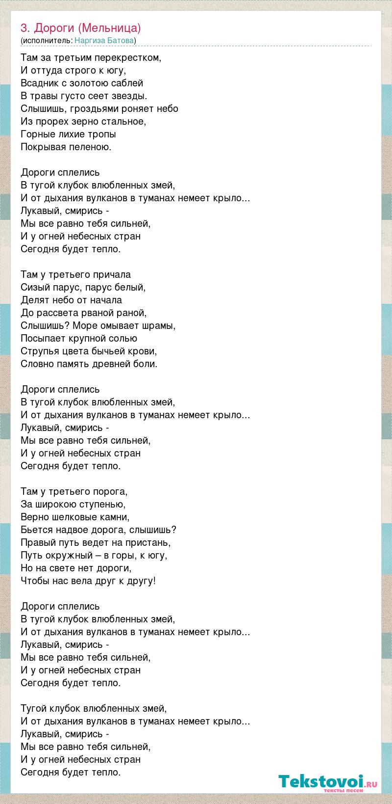 Там за третьим перекрестком, И оттуда строго к югу, Всадник с золотою саблей В травы густо сеет звезды. Слышишь, гроздьями роняет небо Из прорех зерно стальное, Горные лихие тропы Покрывая пеленою. Дороги сплелись В тугой клубок влюбленных змей, И от дыхания вулканов в туманах немеет крыло... Лукавый, смирись - Мы все равно тебя сильней, И у огней небесных стран Сегодня будет тепло. Там у третьего причала Сизый парус, парус белый, Делят небо от начала До рассвета рваной раной, Слышишь? Море омывает шрамы, Посыпает крупной солью Струпья цвета бычьей крови, Словно память древней боли. Дороги сплелись В тугой клубок влюбленных змей, И от дыхания вулканов в туманах немеет крыло... Лукавый, смирись - Мы все равно тебя сильней, И у огней небесных стран Сегодня будет тепло. Там у третьего порога, За широкою ступенью, Верно шелковые камни, Бьется надвое дорога, слышишь? Правый путь ведет на пристань, Путь окружный – в горы, к югу, Но на свете нет дороги, Чтобы нас вела друг к другу! Дороги сплелись В тугой клубок влюбленных змей, И от дыхания вулканов в туманах немеет крыло... Лукавый, смирись - Мы все равно тебя сильней, И у огней небесных стран Сегодня будет тепло. Тугой клубок влюбленных змей, И от дыхания вулканов в туманах немеет крыло... Лукавый, смирись - Мы все равно тебя сильней, И у огней небесных стран Сегодня будет тепло.