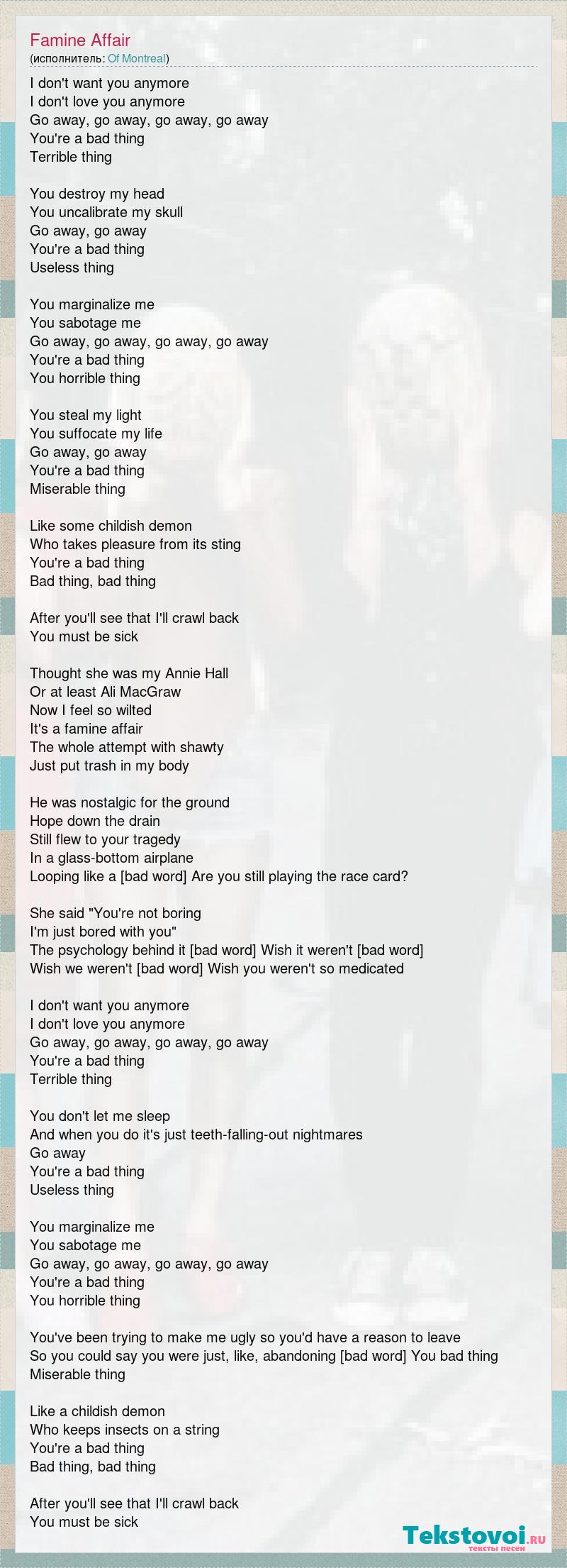 I don't want you anymore I don't love you anymore Go away, go away, go away, go away You're a bad thing Terrible thing You destroy my head You uncalibrate my skull Go away, go away You're a bad thing Useless thing You marginalize me You sabotage me Go away, go away, go away, go away You're a bad thing You horrible thing You steal my light You suffocate my life Go away, go away You're a bad thing Miserable thing Like some childish demon Who takes pleasure from its sting You're a bad thing Bad thing, bad thing After you'll see that I'll crawl back You must be sick Thought she was my Annie Hall Or at least Ali MacGraw Now I feel so wilted It's a famine affair The whole attempt with shawty Just put trash in my body He was nostalgic for the ground Hope down the drain Still flew to your tragedy In a glass-bottom airplane Looping like a [bad word] Are you still playing the race card? She said "You're not boring I'm just bored with you" The psychology behind it is ruthless Wish it weren't true Wish we weren't so complicated Wish you weren't so medicated I don't want you anymore I don't love you anymore Go away, go away, go away, go away You're a bad thing Terrible thing You don't let me sleep And when you do it's just teeth-falling-out nightmares Go away You're a bad thing Useless thing You marginalize me You sabotage me Go away, go away, go away, go away You're a bad thing You horrible thing You've been trying to make me ugly so you'd have a reason to leave So you could say you were just, like, abandoning the ruins You bad thing Miserable thing Like a childish demon Who keeps insects on a string You're a bad thing Bad thing, bad thing After you'll see that I'll crawl back You must be sick