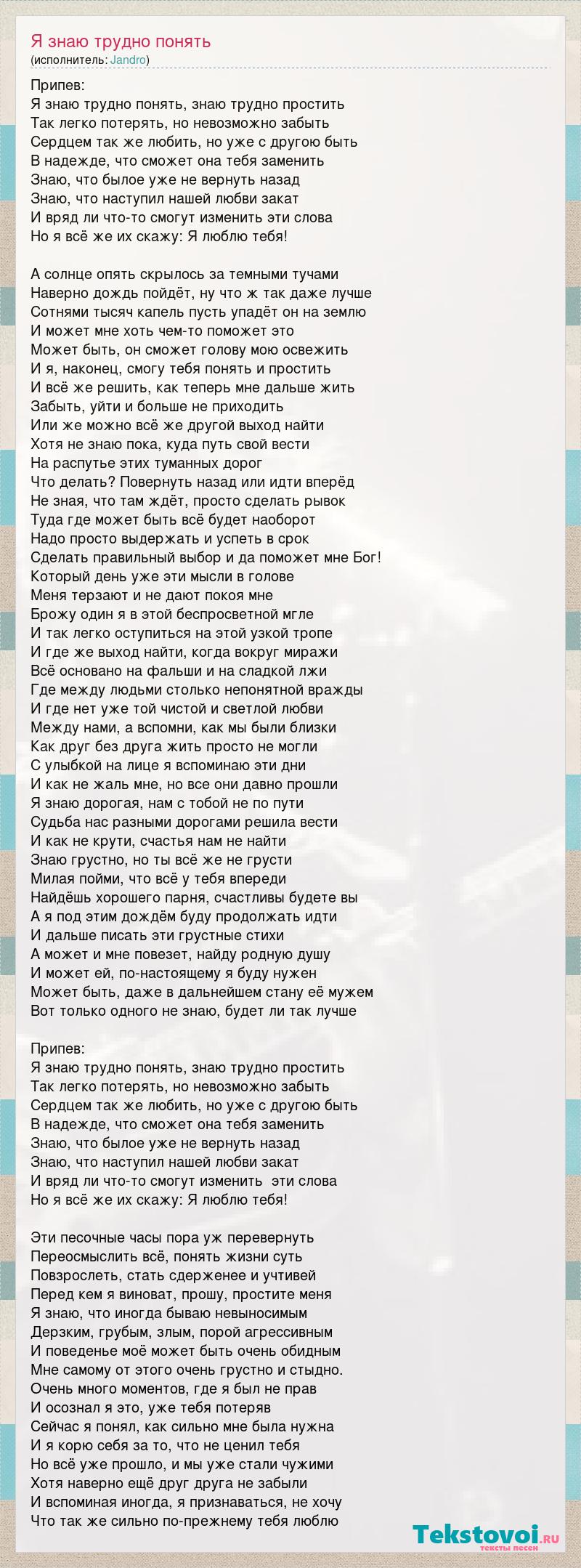 Припев: Я знаю трудно понять, знаю трудно простить Так легко потерять, но невозможно забыть Сердцем так же любить, но уже с другою быть В надежде, что сможет она тебя заменить Знаю, что былое уже не вернуть назад Знаю, что наступил нашей любви закат И вряд ли что-то смогут изменить эти слова Но я всё же их скажу: Я люблю тебя! А солнце опять скрылось за темными тучами Наверно дождь пойдёт, ну что ж так даже лучше Сотнями тысяч капель пусть упадёт он на землю И может мне хоть чем-то поможет это Может быть, он сможет голову мою освежить И я, наконец, смогу тебя понять и простить И всё же решить, как теперь мне дальше жить Забыть, уйти и больше не приходить Или же можно всё же другой выход найти Хотя не знаю пока, куда путь свой вести На распутье этих туманных дорог Что делать? Повернуть назад или идти вперёд Не зная, что там ждёт, просто сделать рывок Туда где может быть всё будет наоборот Надо просто выдержать и успеть в срок Сделать правильный выбор и да поможет мне Бог! Который день уже эти мысли в голове Меня терзают и не дают покоя мне Брожу один я в этой беспросветной мгле И так легко оступиться на этой узкой тропе И где же выход найти, когда вокруг миражи Всё основано на фальши и на сладкой лжи Где между людьми столько непонятной вражды И где нет уже той чистой и светлой любви Между нами, а вспомни, как мы были близки Как друг без друга жить просто не могли С улыбкой на лице я вспоминаю эти дни И как не жаль мне, но все они давно прошли Я знаю дорогая, нам с тобой не по пути Судьба нас разными дорогами решила вести И как не крути, счастья нам не найти Знаю грустно, но ты всё же не грусти Милая пойми, что всё у тебя впереди Найдёшь хорошего парня, счастливы будете вы А я под этим дождём буду продолжать идти И дальше писать эти грустные стихи А может и мне повезет, найду родную душу И может ей, по-настоящему я буду нужен Может быть, даже в дальнейшем стану её мужем Вот только одного не знаю, будет ли так лучше Припев: Я знаю трудно понять, знаю трудно простить Так легко потерять, но невозможно забыть Сердцем так же любить, но уже с другою быть В надежде, что сможет она тебя заменить Знаю, что былое уже не вернуть назад Знаю, что наступил нашей любви закат И вряд ли что-то смогут изменить эти слова Но я всё же их скажу: Я люблю тебя! Эти песочные часы пора уж перевернуть Переосмыслить всё, понять жизни суть Повзрослеть, стать сдерженее и учтивей Перед кем я виноват, прошу, простите меня Я знаю, что иногда бываю невыносимым Дерзким, грубым, злым, порой агрессивным И поведенье моё может быть очень обидным Мне самому от этого очень грустно и стыдно. Очень много моментов, где я был не прав И осознал я это, уже тебя потеряв Сейчас я понял, как сильно мне была нужна И я корю себя за то, что не ценил тебя Но всё уже прошло, и мы уже стали чужими Хотя наверно ещё друг друга не забыли И вспоминая иногда, я признаваться, не хочу Что так же сильно по-прежнему тебя люблю