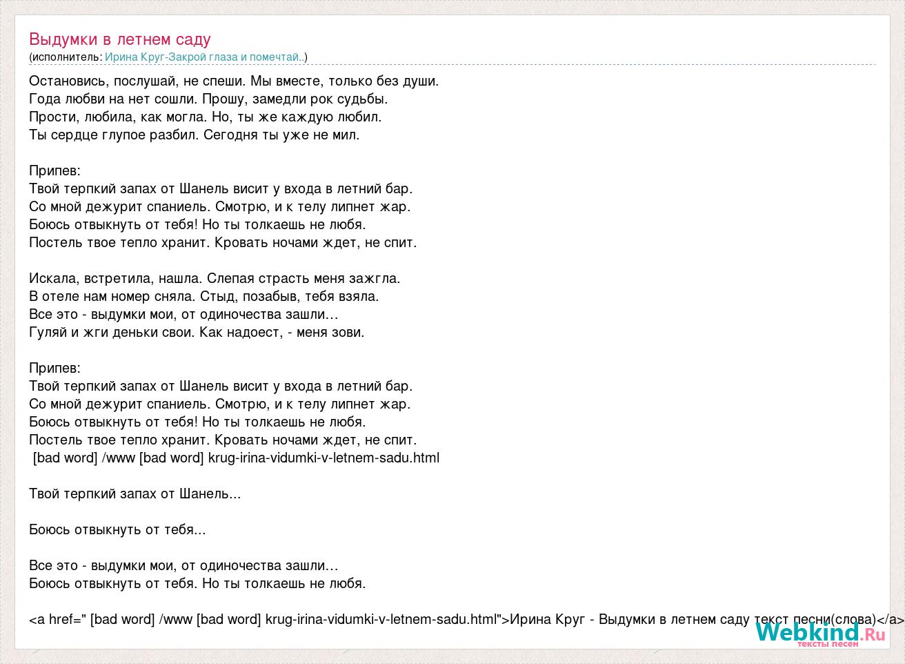 Остановись, послушай, не спеши. Мы вместе, только без души. Года любви на нет сошли. Прошу, замедли рок судьбы. Прости, любила, как могла. Но, ты же каждую любил. Ты сердце глупое разбил. Сегодня ты уже не мил. Припев: Твой терпкий запах от Шанель висит у входа в летний бар. Со мной дежурит спаниель. Смотрю, и к телу липнет жар. Боюсь отвыкнуть от тебя! Но ты толкаешь не любя. Постель твое тепло хранит. Кровать ночами ждет, не спит. Искала, встретила, нашла. Слепая страсть меня зажгла. В отеле нам номер сняла. Стыд, позабыв, тебя взяла. Все это - выдумки мои, от одиночества зашли… Гуляй и жги деньки свои. Как надоест, - меня зови. Припев: Твой терпкий запах от Шанель висит у входа в летний бар. Со мной дежурит спаниель. Смотрю, и к телу липнет жар. Боюсь отвыкнуть от тебя! Но ты толкаешь не любя. Постель твое тепло хранит. Кровать ночами ждет, не спит. [bad word] /www [bad word] krug-irina-vidumki-v-letnem-sadu.html Твой терпкий запах от Шанель... Боюсь отвыкнуть от тебя... Все это - выдумки мои, от одиночества зашли… Боюсь отвыкнуть от тебя. Но ты толкаешь не любя. <a href=" [bad word] /www [bad word] krug-irina-vidumki-v-letnem-sadu.html">Ирина Круг - Выдумки в летнем саду текст песни(слова)</a>