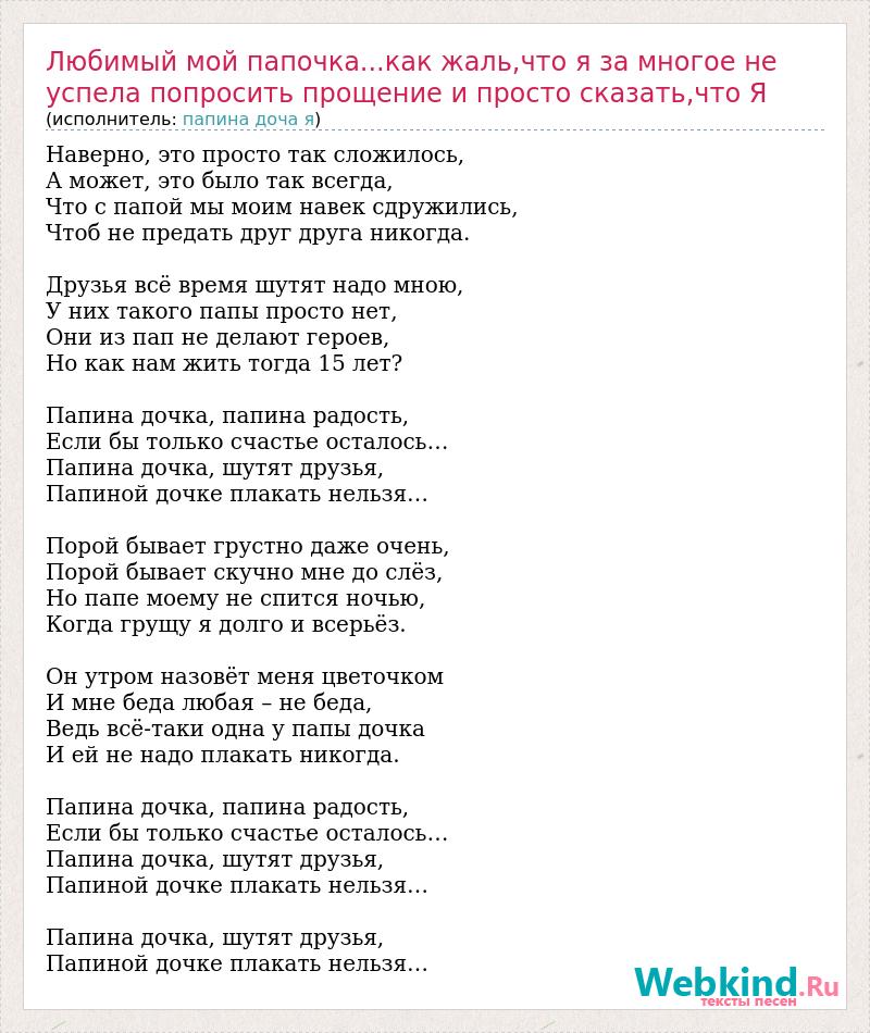 Наверно, это просто так сложилось, А может, это было так всегда, Что с папой мы моим навек сдружились, Чтоб не предать друг друга никогда. Друзья всё время шутят надо мною, У них такого папы просто нет, Они из пап не делают героев, Но как нам жить тогда 15 лет? Папина дочка, папина радость, Если бы только счастье осталось… Папина дочка, шутят друзья, Папиной дочке плакать нельзя… Порой бывает грустно даже очень, Порой бывает скучно мне до слёз, Но папе моему не спится ночью, Когда грущу я долго и всерьёз. Он утром назовёт меня цветочком И мне беда любая – не беда, Ведь всё-таки одна у папы дочка И ей не надо плакать никогда. Папина дочка, папина радость, Если бы только счастье осталось… Папина дочка, шутят друзья, Папиной дочке плакать нельзя… Папина дочка, шутят друзья, Папиной дочке плакать нельзя…