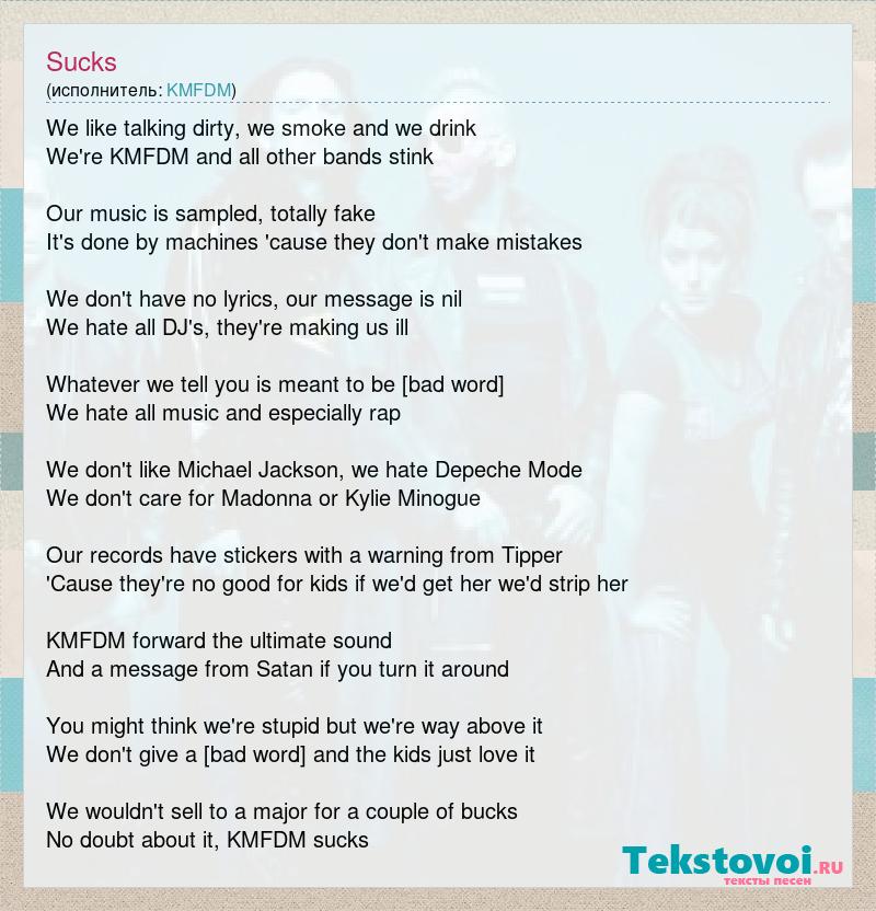 We like talking dirty, we smoke and we drink We're KMFDM and all other bands stink Our music is sampled, totally fake It's done by machines 'cause they don't make mistakes We don't have no lyrics, our message is nil We hate all DJ's, they're making us ill Whatever we tell you is meant to be [bad word] We hate all music and especially rap We don't like Michael Jackson, we hate Depeche Mode We don't care for Madonna or Kylie Minogue Our records have stickers with a warning from Tipper 'Cause they're no good for kids if we'd get her we'd strip her KMFDM forward the ultimate sound And a message from Satan if you turn it around You might think we're stupid but we're way above it We don't give a [bad word] and the kids just love it We wouldn't sell to a major for a couple of bucks No doubt about it, KMFDM sucks