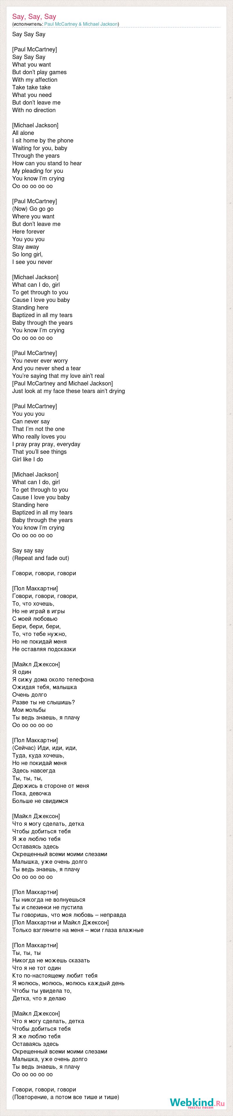 Say Say Say [Paul McCartney] Say Say Say What you want But don’t play games With my affection Take take take What you need But don’t leave me With no direction [Michael Jackson] All alone I sit home by the phone Waiting for you, baby Through the years How can you stand to hear My pleading for you You know I’m crying Oo oo oo oo oo [Paul McCartney] (Now) Go go go Where you want But don’t leave me Here forever You you you Stay away So long girl, I see you never [Michael Jackson] What can I do, girl To get through to you Cause I love you baby Standing here Baptized in all my tears Baby through the years You know I’m crying Oo oo oo oo oo [Paul McCartney] You never ever worry And you never shed a tear You’re saying that my love ain’t real [Paul McCartney and Michael Jackson] Just look at my face these tears ain’t drying [Paul McCartney] You you you Can never say That I’m not the one Who really loves you I pray pray pray, everyday That you’ll see things Girl like I do [Michael Jackson] What can I do, girl To get through to you Cause I love you baby Standing here Baptized in all my tears Baby through the years You know I’m crying Oo oo oo oo oo Say say say (Repeat and fade out) Говори, говори, говори [Пол Маккартни] Говори, говори, говори, То, что хочешь, Но не играй в игры С моей любовью Бери, бери, бери, То, что тебе нужно, Но не покидай меня Не оставляя подсказки [Майкл Джексон] Я один Я сижу дома около телефона Ожидая тебя, малышка Очень долго Разве ты не слышишь? Мои мольбы Ты ведь знаешь, я плачу Оо оо оо оо оо [Пол Маккартни] (Сейчас) Иди, иди, иди, Туда, куда хочешь, Но не покидай меня Здесь навсегда Ты, ты, ты, Держись в стороне от меня Пока, девочка Больше не свидимся [Майкл Джексон] Что я могу сделать, детка Чтобы добиться тебя Я же люблю тебя Оставаясь здесь Окрещенный всеми моими слезами Малышка, уже очень долго Ты ведь знаешь, я плачу Оо оо оо оо оо [Пол Маккартни] Ты никогда не волнуешься Ты и слезинки не пустила Ты говоришь, что моя любовь – неправда [Пол Маккартни и Майкл Джексон] Только взгляните на меня – мои глаза влажные [Пол Маккартни] Ты, ты, ты Никогда не можешь сказать Что я не тот один Кто по-настоящему любит тебя Я молюсь, молюсь, молюсь каждый день Чтобы ты увидела то, Детка, что я делаю [Майкл Джексон] Что я могу сделать, детка Чтобы добиться тебя Я же люблю тебя Оставаясь здесь Окрещенный всеми моими слезами Малышка, уже очень долго Ты ведь знаешь, я плачу Оо оо оо оо оо Говори, говори, говори (Повторение, а потом все тише и тише)
