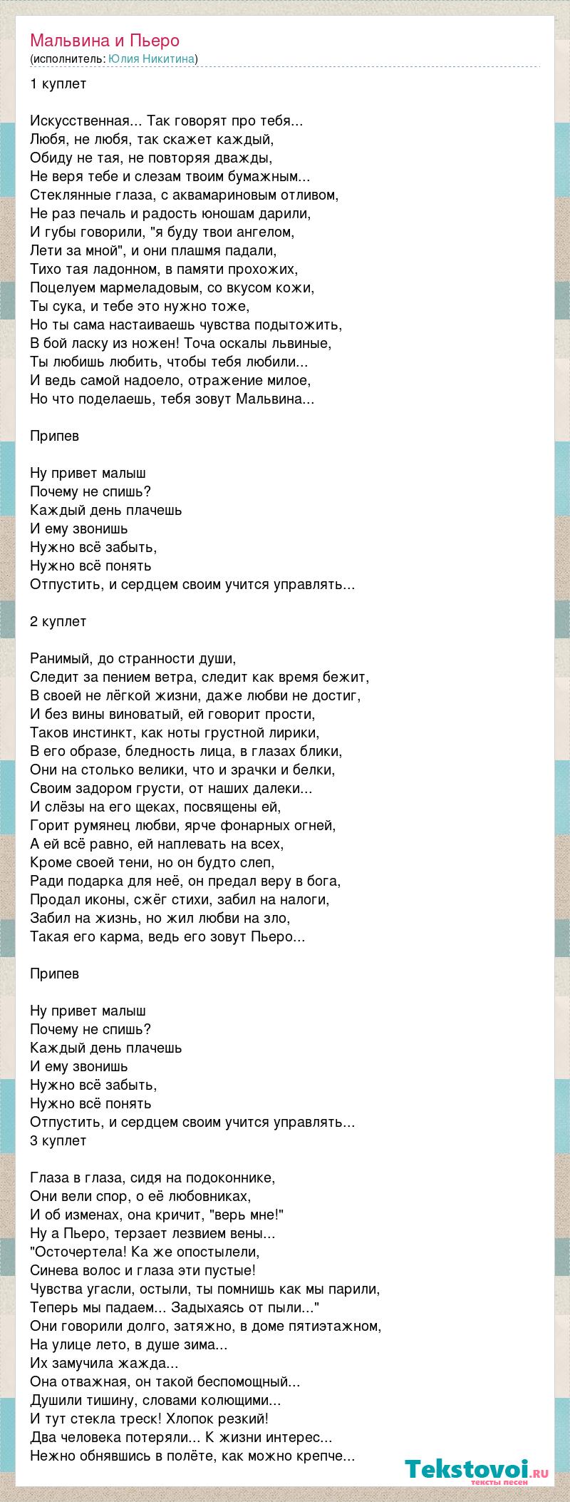 1 куплет Искусственная... Так говорят про тебя... Любя, не любя, так скажет каждый, Обиду не тая, не повторяя дважды, Не веря тебе и слезам твоим бумажным... Стеклянные глаза, с аквамариновым отливом, Не раз печаль и радость юношам дарили, И губы говорили, "я буду твои ангелом, Лети за мной", и они плашмя падали, Тихо тая ладонном, в памяти прохожих, Поцелуем мармеладовым, со вкусом кожи, Ты сука, и тебе это нужно тоже, Но ты сама настаиваешь чувства подытожить, В бой ласку из ножен! Точа оскалы львиные, Ты любишь любить, чтобы тебя любили... И ведь самой надоело, отражение милое, Но что поделаешь, тебя зовут Мальвина... Припев Ну привет малыш Почему не спишь? Каждый день плачешь И ему звонишь Нужно всё забыть, Нужно всё понять Отпустить, и сердцем своим учится управлять... 2 куплет Ранимый, до странности души, Следит за пением ветра, следит как время бежит, В своей не лёгкой жизни, даже любви не достиг, И без вины виноватый, ей говорит прости, Таков инстинкт, как ноты грустной лирики, В его образе, бледность лица, в глазах блики, Они на столько велики, что и зрачки и белки, Своим задором грусти, от наших далеки... И слёзы на его щеках, посвящены ей, Горит румянец любви, ярче фонарных огней, А ей всё равно, ей наплевать на всех, Кроме своей тени, но он будто слеп, Ради подарка для неё, он предал веру в бога, Продал иконы, сжёг стихи, забил на налоги, Забил на жизнь, но жил любви на зло, Такая его карма, ведь его зовут Пьеро... Припев Ну привет малыш Почему не спишь? Каждый день плачешь И ему звонишь Нужно всё забыть, Нужно всё понять Отпустить, и сердцем своим учится управлять... 3 куплет Глаза в глаза, сидя на подоконнике, Они вели спор, о её любовниках, И об изменах, она кричит, "верь мне!" Ну а Пьеро, терзает лезвием вены... "Осточертела! Ка же опостылели, Синева волос и глаза эти пустые! Чувства угасли, остыли, ты помнишь как мы парили, Теперь мы падаем... Задыхаясь от пыли..." Они говорили долго, затяжно, в доме пятиэтажном, На улице лето, в душе зима... Их замучила жажда... Она отважная, он такой беспомощный... Душили тишину, словами колющими... И тут стекла треск! Хлопок резкий! Два человека потеряли... К жизни интерес... Нежно обнявшись в полёте, как можно крепче...