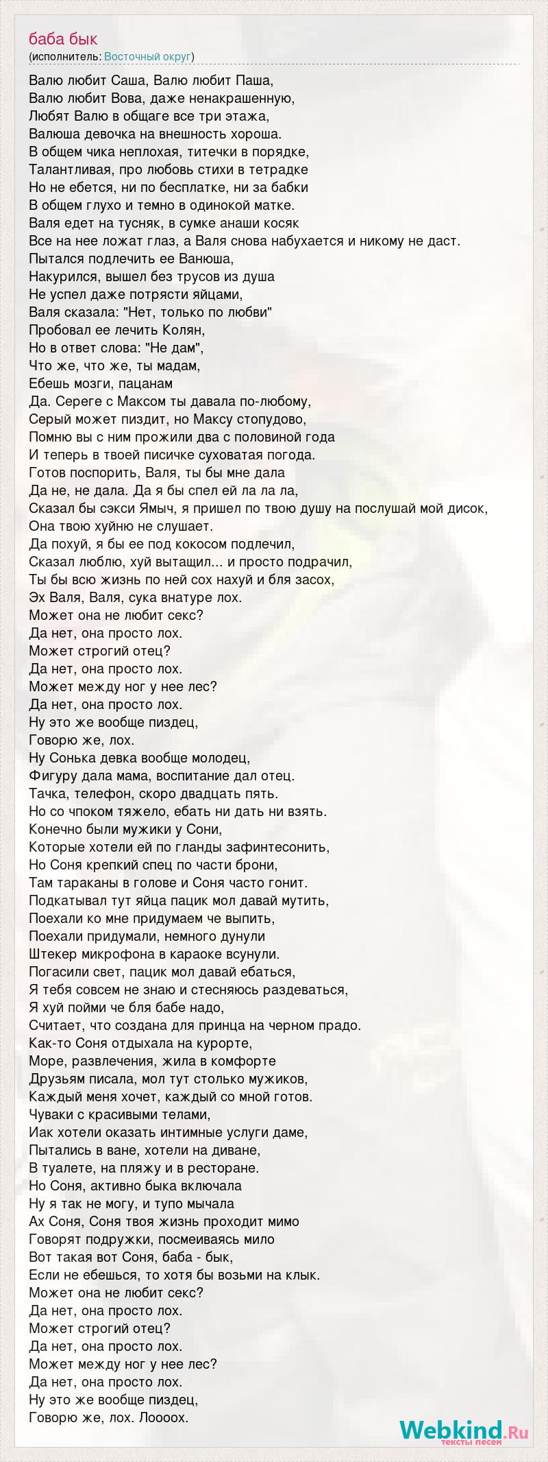 Валю любит Саша, Валю любит Паша, Валю любит Вова, даже ненакрашенную, Любят Валю в общаге все три этажа, Валюша девочка на внешность хороша. В общем чика неплохая, титечки в порядке, Талантливая, про любовь стихи в тетрадке Но не ебется, ни по бесплатке, ни за бабки В общем глухо и темно в одинокой матке. Валя едет на тусняк, в сумке анаши косяк Все на нее ложат глаз, а Валя снова набухается и никому не даст. Пытался подлечить ее Ванюша, Накурился, вышел без трусов из душа Не успел даже потрясти яйцами, Валя сказала: "Нет, только по любви" Пробовал ее лечить Колян, Но в ответ слова: "Не дам", Что же, что же, ты мадам, Ебешь мозги, пацанам Да. Сереге с Максом ты давала по-любому, Серый может пиздит, но Максу стопудово, Помню вы с ним прожили два с половиной года И теперь в твоей писичке суховатая погода. Готов поспорить, Валя, ты бы мне дала Да не, не дала. Да я бы спел ей ла ла ла, Сказал бы сэкси Ямыч, я пришел по твою душу на послушай мой дисок, Она твою хуйню не слушает. Да похуй, я бы ее под кокосом подлечил, Сказал люблю, хуй вытащил... и просто подрачил, Ты бы всю жизнь по ней сох нахуй и бля засох, Эх Валя, Валя, сука внатуре лох. Может она не любит секс? Да нет, она просто лох. Может строгий отец? Да нет, она просто лох. Может между ног у нее лес? Да нет, она просто лох. Ну это же вообще пиздец, Говорю же, лох. Ну Сонька девка вообще молодец, Фигуру дала мама, воспитание дал отец. Тачка, телефон, скоро двадцать пять. Но со чпоком тяжело, ебать ни дать ни взять. Конечно были мужики у Сони, Которые хотели ей по гланды зафинтесонить, Но Соня крепкий спец по части брони, Там тараканы в голове и Соня часто гонит. Подкатывал тут яйца пацик мол давай мутить, Поехали ко мне придумаем че выпить, Поехали придумали, немного дунули Штекер микрофона в караоке всунули. Погасили свет, пацик мол давай ебаться, Я тебя совсем не знаю и стесняюсь раздеваться, Я хуй пойми че бля бабе надо, Считает, что создана для принца на черном прадо. Как-то Соня отдыхала на курорте, Море, развлечения, жила в комфорте Друзьям писала, мол тут столько мужиков, Каждый меня хочет, каждый со мной готов. Чуваки с красивыми телами, Иак хотели оказать интимные услуги даме, Пытались в ване, хотели на диване, В туалете, на пляжу и в ресторане. Но Соня, активно быка включала Ну я так не могу, и тупо мычала Ах Соня, Соня твоя жизнь проходит мимо Говорят подружки, посмеиваясь мило Вот такая вот Соня, баба - бык, Если не ебешься, то хотя бы возьми на клык. Может она не любит секс? Да нет, она просто лох. Может строгий отец? Да нет, она просто лох. Может между ног у нее лес? Да нет, она просто лох. Ну это же вообще пиздец, Говорю же, лох. Лоооох.