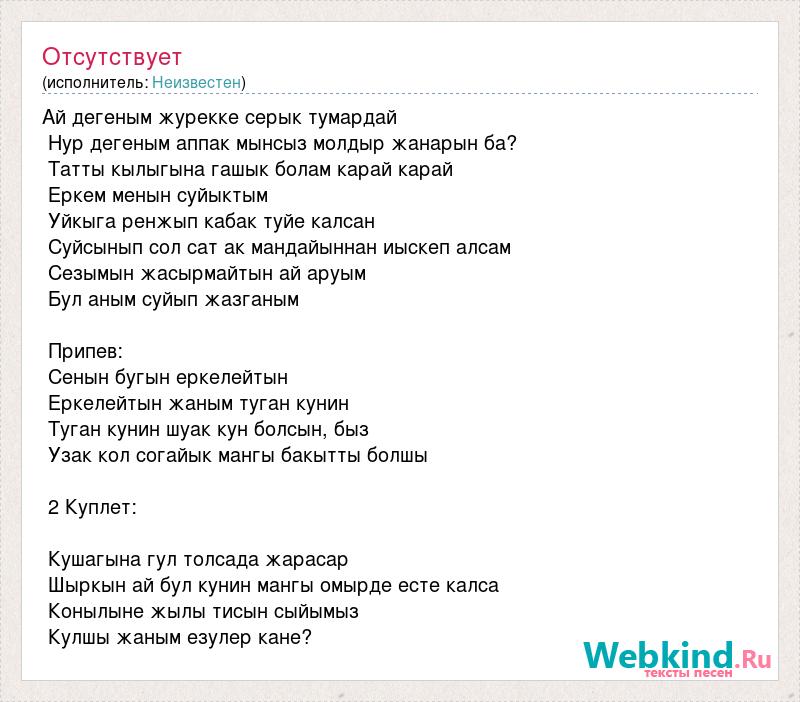 Ай дегеным журекке серык тумардай Нур дегеным аппак мынсыз молдыр жанарын ба? Татты кылыгына гашык болам карай карай Еркем менын суйыктым Уйкыга ренжып кабак туйе калсан Суйсынып сол сат ак мандайыннан иыскеп алсам Сезымын жасырмайтын ай аруым Бул аным суйып жазганым Припев: Сенын бугын еркелейтын Еркелейтын жаным туган кунин Туган кунин шуак кун болсын, быз Узак кол согайык мангы бакытты болшы 2 Куплет: Кушагына гул толсада жарасар Шыркын ай бул кунин мангы омырде есте калса Конылыне жылы тисын сыйымыз Кулшы жаным езулер кане?