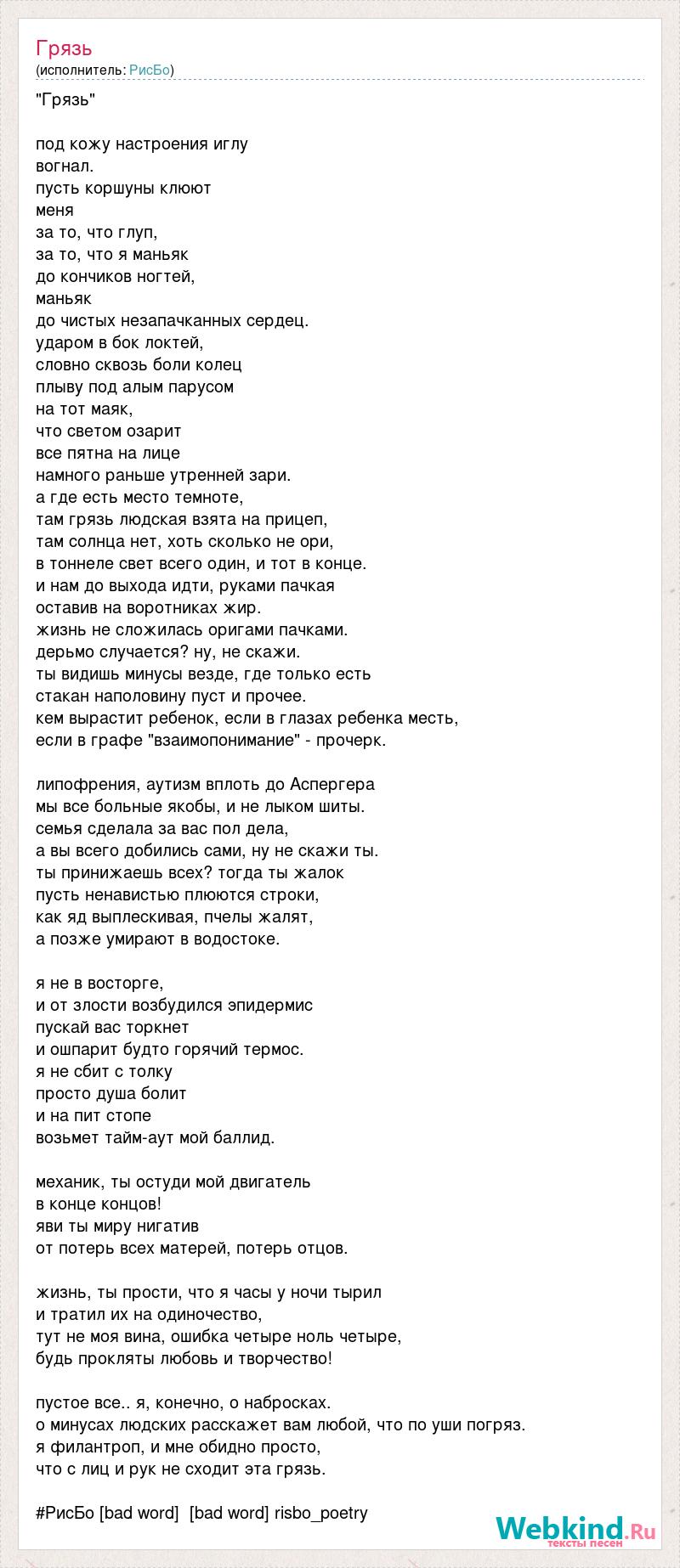 "Грязь" под кожу настроения иглу вогнал. пусть коршуны клюют меня за то, что глуп, за то, что я маньяк до кончиков ногтей, маньяк до чистых незапачканных сердец. ударом в бок локтей, словно сквозь боли колец плыву под алым парусом на тот маяк, что светом озарит все пятна на лице намного раньше утренней зари. а где есть место темноте, там грязь людская взята на прицеп, там солнца нет, хоть сколько не ори, в тоннеле свет всего один, и тот в конце. и нам до выхода идти, руками пачкая оставив на воротниках жир. жизнь не сложилась оригами пачками. дерьмо случается? ну, не скажи. ты видишь минусы везде, где только есть стакан наполовину пуст и прочее. кем вырастит ребенок, если в глазах ребенка месть, если в графе "взаимопонимание" - прочерк. липофрения, аутизм вплоть до Аспергера мы все больные якобы, и не лыком шиты. семья сделала за вас пол дела, а вы всего добились сами, ну не скажи ты. ты принижаешь всех? тогда ты жалок пусть ненавистью плюются строки, как яд выплескивая, пчелы жалят, а позже умирают в водостоке. я не в восторге, и от злости возбудился эпидермис пускай вас торкнет и ошпарит будто горячий термос. я не сбит с толку просто душа болит и на пит стопе возьмет тайм-аут мой баллид. механик, ты остуди мой двигатель в конце концов! яви ты миру нигатив от потерь всех матерей, потерь отцов. жизнь, ты прости, что я часы у ночи тырил и тратил их на одиночество, тут не моя вина, ошибка четыре ноль четыре, будь прокляты любовь и творчество! пустое все.. я, конечно, о набросках. о минусах людских расскажет вам любой, что по уши погряз. я филантроп, и мне обидно просто, что с лиц и рук не сходит эта грязь. #РисБо [bad word] [bad word] risbo_poetry