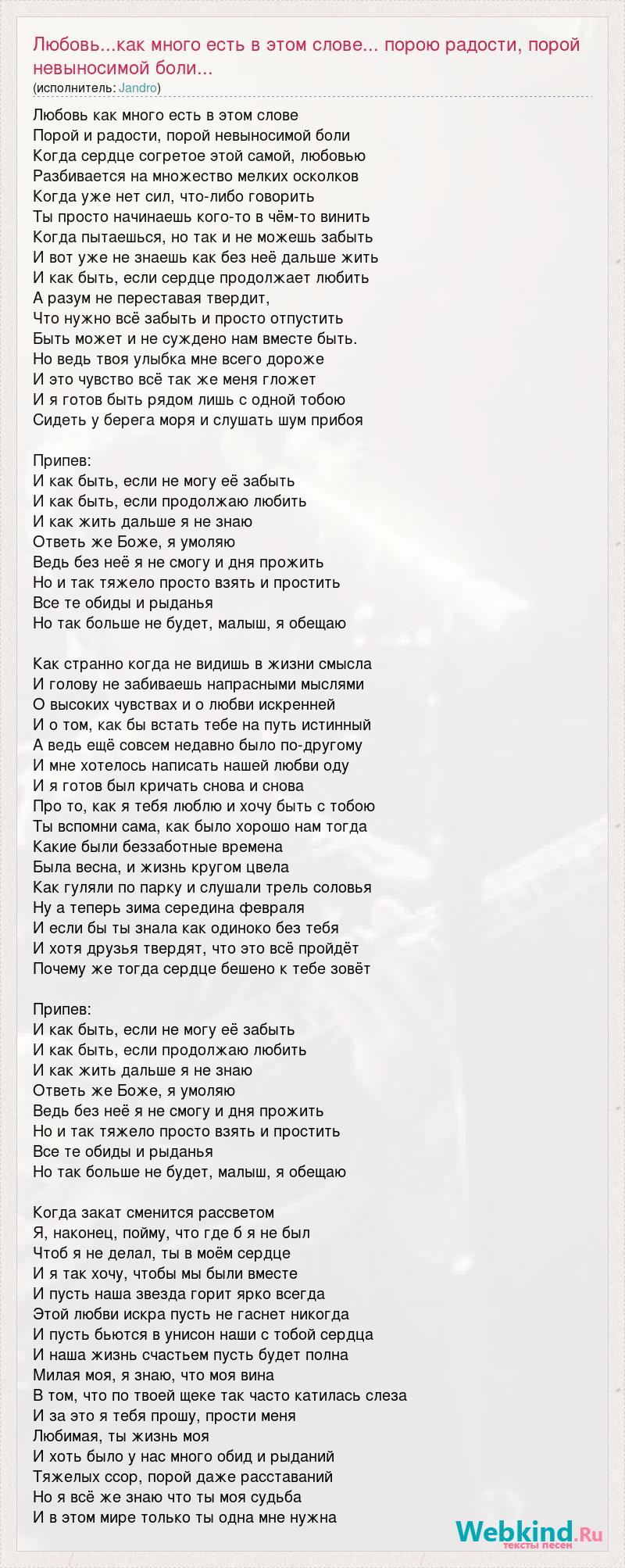 Любовь как много есть в этом слове Порой и радости, порой невыносимой боли Когда сердце согретое этой самой, любовью Разбивается на множество мелких осколков Когда уже нет сил, что-либо говорить Ты просто начинаешь кого-то в чём-то винить Когда пытаешься, но так и не можешь забыть И вот уже не знаешь как без неё дальше жить И как быть, если сердце продолжает любить А разум не переставая твердит, Что нужно всё забыть и просто отпустить Быть может и не суждено нам вместе быть. Но ведь твоя улыбка мне всего дороже И это чувство всё так же меня гложет И я готов быть рядом лишь с одной тобою Сидеть у берега моря и слушать шум прибоя Припев: И как быть, если не могу её забыть И как быть, если продолжаю любить И как жить дальше я не знаю Ответь же Боже, я умоляю Ведь без неё я не смогу и дня прожить Но и так тяжело просто взять и простить Все те обиды и рыданья Но так больше не будет, малыш, я обещаю Как странно когда не видишь в жизни смысла И голову не забиваешь напрасными мыслями О высоких чувствах и о любви искренней И о том, как бы встать тебе на путь истинный А ведь ещё совсем недавно было по-другому И мне хотелось написать нашей любви оду И я готов был кричать снова и снова Про то, как я тебя люблю и хочу быть с тобою Ты вспомни сама, как было хорошо нам тогда Какие были беззаботные времена Была весна, и жизнь кругом цвела Как гуляли по парку и слушали трель соловья Ну а теперь зима середина февраля И если бы ты знала как одиноко без тебя И хотя друзья твердят, что это всё пройдёт Почему же тогда сердце бешено к тебе зовёт Припев: И как быть, если не могу её забыть И как быть, если продолжаю любить И как жить дальше я не знаю Ответь же Боже, я умоляю Ведь без неё я не смогу и дня прожить Но и так тяжело просто взять и простить Все те обиды и рыданья Но так больше не будет, малыш, я обещаю Когда закат сменится рассветом Я, наконец, пойму, что где б я не был Чтоб я не делал, ты в моём сердце И я так хочу, чтобы мы были вместе И пусть наша звезда горит ярко всегда Этой любви искра пусть не гаснет никогда И пусть бьются в унисон наши с тобой сердца И наша жизнь счастьем пусть будет полна Милая моя, я знаю, что моя вина В том, что по твоей щеке так часто катилась слеза И за это я тебя прошу, прости меня Любимая, ты жизнь моя И хоть было у нас много обид и рыданий Тяжелых ссор, порой даже расставаний Но я всё же знаю что ты моя судьба И в этом мире только ты одна мне нужна