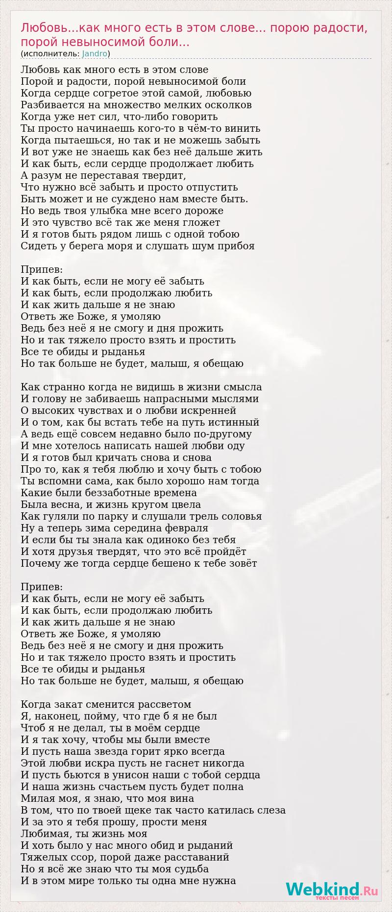 Любовь как много есть в этом слове Порой и радости, порой невыносимой боли Когда сердце согретое этой самой, любовью Разбивается на множество мелких осколков Когда уже нет сил, что-либо говорить Ты просто начинаешь кого-то в чём-то винить Когда пытаешься, но так и не можешь забыть И вот уже не знаешь как без неё дальше жить И как быть, если сердце продолжает любить А разум не переставая твердит, Что нужно всё забыть и просто отпустить Быть может и не суждено нам вместе быть. Но ведь твоя улыбка мне всего дороже И это чувство всё так же меня гложет И я готов быть рядом лишь с одной тобою Сидеть у берега моря и слушать шум прибоя Припев: И как быть, если не могу её забыть И как быть, если продолжаю любить И как жить дальше я не знаю Ответь же Боже, я умоляю Ведь без неё я не смогу и дня прожить Но и так тяжело просто взять и простить Все те обиды и рыданья Но так больше не будет, малыш, я обещаю Как странно когда не видишь в жизни смысла И голову не забиваешь напрасными мыслями О высоких чувствах и о любви искренней И о том, как бы встать тебе на путь истинный А ведь ещё совсем недавно было по-другому И мне хотелось написать нашей любви оду И я готов был кричать снова и снова Про то, как я тебя люблю и хочу быть с тобою Ты вспомни сама, как было хорошо нам тогда Какие были беззаботные времена Была весна, и жизнь кругом цвела Как гуляли по парку и слушали трель соловья Ну а теперь зима середина февраля И если бы ты знала как одиноко без тебя И хотя друзья твердят, что это всё пройдёт Почему же тогда сердце бешено к тебе зовёт Припев: И как быть, если не могу её забыть И как быть, если продолжаю любить И как жить дальше я не знаю Ответь же Боже, я умоляю Ведь без неё я не смогу и дня прожить Но и так тяжело просто взять и простить Все те обиды и рыданья Но так больше не будет, малыш, я обещаю Когда закат сменится рассветом Я, наконец, пойму, что где б я не был Чтоб я не делал, ты в моём сердце И я так хочу, чтобы мы были вместе И пусть наша звезда горит ярко всегда Этой любви искра пусть не гаснет никогда И пусть бьются в унисон наши с тобой сердца И наша жизнь счастьем пусть будет полна Милая моя, я знаю, что моя вина В том, что по твоей щеке так часто катилась слеза И за это я тебя прошу, прости меня Любимая, ты жизнь моя И хоть было у нас много обид и рыданий Тяжелых ссор, порой даже расставаний Но я всё же знаю что ты моя судьба И в этом мире только ты одна мне нужна