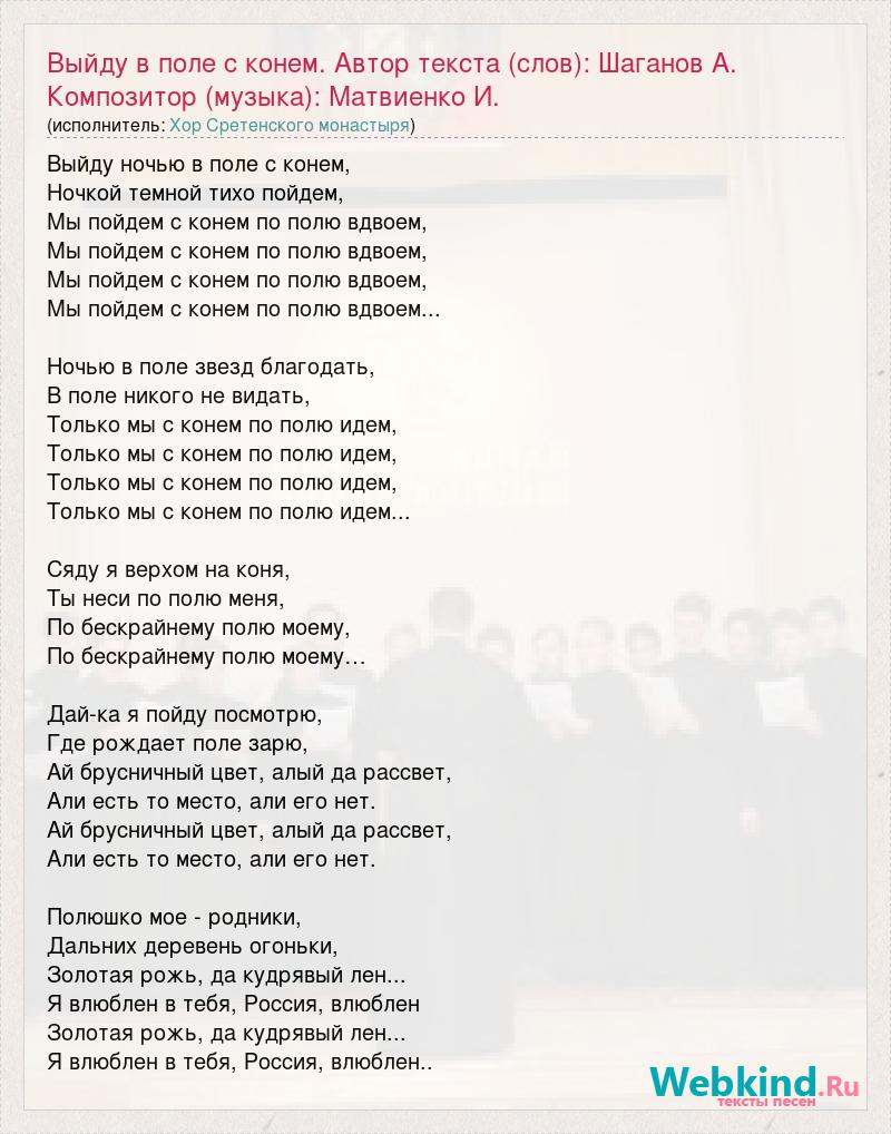 Выйду ночью в поле с конем, Ночкой темной тихо пойдем, Мы пойдем с конем по полю вдвоем, Мы пойдем с конем по полю вдвоем, Мы пойдем с конем по полю вдвоем, Мы пойдем с конем по полю вдвоем... Ночью в поле звезд благодать, В поле никого не видать, Только мы с конем по полю идем, Только мы с конем по полю идем, Только мы с конем по полю идем, Только мы с конем по полю идем... Сяду я верхом на коня, Ты неси по полю меня, По бескрайнему полю моему, По бескрайнему полю моему… Дай-ка я пойду посмотрю, Где рождает поле зарю, Ай брусничный цвет, алый да рассвет, Али есть то место, али его нет. Ай брусничный цвет, алый да рассвет, Али есть то место, али его нет. Полюшко мое - родники, Дальних деревень огоньки, Золотая рожь, да кудрявый лен... Я влюблен в тебя, Россия, влюблен Золотая рожь, да кудрявый лен... Я влюблен в тебя, Россия, влюблен..