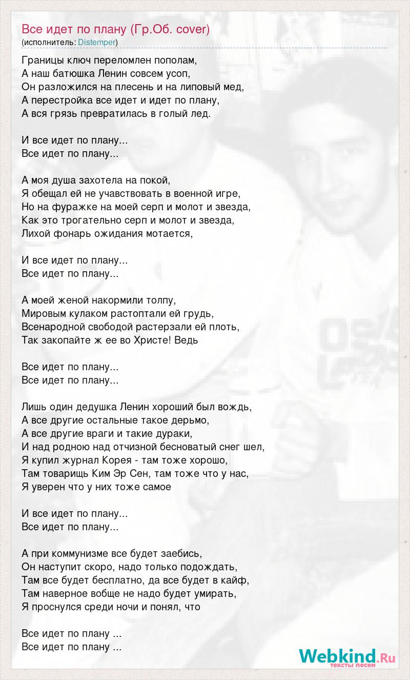 Границы ключ переломлен пополам, А наш батюшка Ленин совсем усоп, Он разложился на плесень и на липовый мед, А перестройка все идет и идет по плану, А вся грязь превратилась в голый лед. И все идет по плану... Все идет по плану... А моя душа захотела на покой, Я обещал ей не учавствовать в военной игре, Но на фуражке на моей серп и молот и звезда, Как это трогательно серп и молот и звезда, Лихой фонарь ожидания мотается, И все идет по плану... Все идет по плану... А моей женой накормили толпу, Мировым кулаком растоптали ей грудь, Всенародной свободой растерзали ей плоть, Так закопайте ж ее во Христе! Ведь Все идет по плану... Все идет по плану... Лишь один дедушка Ленин хороший был вождь, А все другие остальные такое дерьмо, А все другие враги и такие дураки, И над родною над отчизной бесноватый снег шел, Я купил журнал Корея - там тоже хорошо, Там товарищь Ким Эр Сен, там тоже что у нас, Я уверен что у них тоже самое И все идет по плану... Все идет по плану... А при коммунизме все будет заебись, Он наступит скоро, надо только подождать, Там все будет бесплатно, да все будет в кайф, Там наверное вобще не надо будет умирать, Я проснулся среди ночи и понял, что Все идет по плану ... Все идет по плану ...