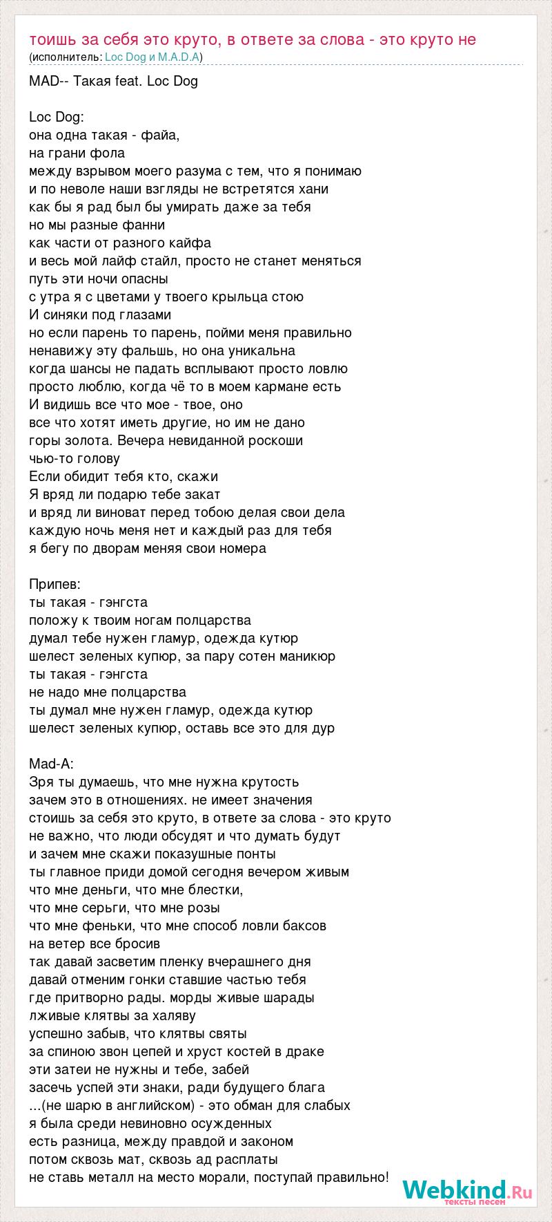 MAD-- Такая feat. Loc Dog Loc Dog: она одна такая - файа, на грани фола между взрывом моего разума c тем, что я понимаю и по неволе наши взгляды не встретятся хани как бы я рад был бы умирать даже за тебя но мы разные фанни как части от разного кайфа и весь мой лайф стайл, просто не станет меняться путь эти ночи опасны с утра я с цветами у твоего крыльца стою И синяки под глазами но если парень то парень, пойми меня правильно ненавижу эту фальшь, но она уникальна когда шансы не падать всплывают просто ловлю просто люблю, когда чё то в моем кармане есть И видишь все что мое - твое, оно все что хотят иметь другие, но им не дано горы золота. Вечера невиданной роскоши чью-то голову Если обидит тебя кто, скажи Я вряд ли подарю тебе закат и вряд ли виноват перед тобою делая свои дела каждую ночь меня нет и каждый раз для тебя я бегу по дворам меняя свои номера Припев: ты такая - гэнгста положу к твоим ногам полцарства думал тебе нужен гламур, одежда кутюр шелест зеленых купюр, за пару сотен маникюр ты такая - гэнгста не надо мне полцарства ты думал мне нужен гламур, одежда кутюр шелест зеленых купюр, оставь все это для дур Mad-A: Зря ты думаешь, что мне нужна крутость зачем это в отношениях. не имеет значения стоишь за себя это круто, в ответе за слова - это круто не важно, что люди обсудят и что думать будут и зачем мне скажи показушные понты ты главное приди домой сегодня вечером живым что мне деньги, что мне блестки, что мне серьги, что мне розы что мне феньки, что мне способ ловли баксов на ветер все бросив так давай засветим пленку вчерашнего дня давай отменим гонки ставшие частью тебя где притворно рады. морды живые шарады лживые клятвы за халяву успешно забыв, что клятвы святы за спиною звон цепей и хруст костей в драке эти затеи не нужны и тебе, забей засечь успей эти знаки, ради будущего блага ...(не шарю в английском) - это обман для слабых я была среди невиновно осужденных есть разница, между правдой и законом потом сквозь мат, сквозь ад расплаты не ставь металл на место морали, поступай правильно!