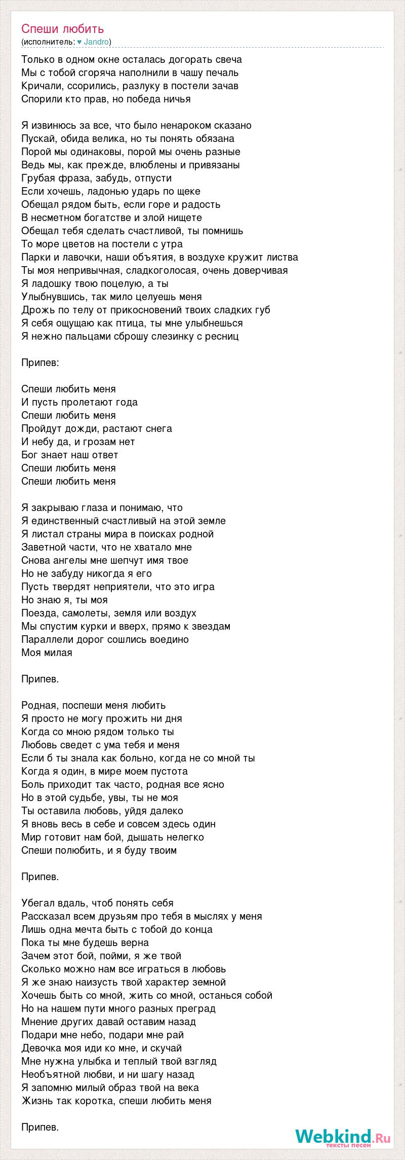 Только в одном окне осталась догорать свеча Мы с тобой сгоряча наполнили в чашу печаль Кричали, ссорились, разлуку в постели зачав Спорили кто прав, но победа ничья Я извинюсь за все, что было ненароком сказано Пускай, обида велика, но ты понять обязана Порой мы одинаковы, порой мы очень разные Ведь мы, как прежде, влюблены и привязаны Грубая фраза, забудь, отпусти Если хочешь, ладонью ударь по щеке Обещал рядом быть, если горе и радость В несметном богатстве и злой нищете Обещал тебя сделать счастливой, ты помнишь То море цветов на постели с утра Парки и лавочки, наши объятия, в воздухе кружит листва Ты моя непривычная, сладкоголосая, очень доверчивая Я ладошку твою поцелую, а ты Улыбнувшись, так мило целуешь меня Дрожь по телу от прикосновений твоих сладких губ Я себя ощущаю как птица, ты мне улыбнешься Я нежно пальцами сброшу слезинку с ресниц Припев: Спеши любить меня И пусть пролетают года Спеши любить меня Пройдут дожди, растают снега И небу да, и грозам нет Бог знает наш ответ Спеши любить меня Спеши любить меня Я закрываю глаза и понимаю, что Я единственный счастливый на этой земле Я листал страны мира в поисках родной Заветной части, что не хватало мне Снова ангелы мне шепчут имя твое Но не забуду никогда я его Пусть твердят неприятели, что это игра Но знаю я, ты моя Поезда, самолеты, земля или воздух Мы спустим курки и вверх, прямо к звездам Параллели дорог сошлись воедино Моя милая Припев. Родная, поспеши меня любить Я просто не могу прожить ни дня Когда со мною рядом только ты Любовь сведет с ума тебя и меня Если б ты знала как больно, когда не со мной ты Когда я один, в мире моем пустота Боль приходит так часто, родная все ясно Но в этой судьбе, увы, ты не моя Ты оставила любовь, уйдя далеко Я вновь весь в себе и совсем здесь один Мир готовит нам бой, дышать нелегко Спеши полюбить, и я буду твоим Припев. Убегал вдаль, чтоб понять себя Рассказал всем друзьям про тебя в мыслях у меня Лишь одна мечта быть с тобой до конца Пока ты мне будешь верна Зачем этот бой, пойми, я же твой Сколько можно нам все играться в любовь Я же знаю наизусть твой характер земной Хочешь быть со мной, жить со мной, останься собой Но на нашем пути много разных преград Мнение других давай оставим назад Подари мне небо, подари мне рай Девочка моя иди ко мне, и скучай Мне нужна улыбка и теплый твой взгляд Необъятной любви, и ни шагу назад Я запомню милый образ твой на века Жизнь так коротка, спеши любить меня Припев.