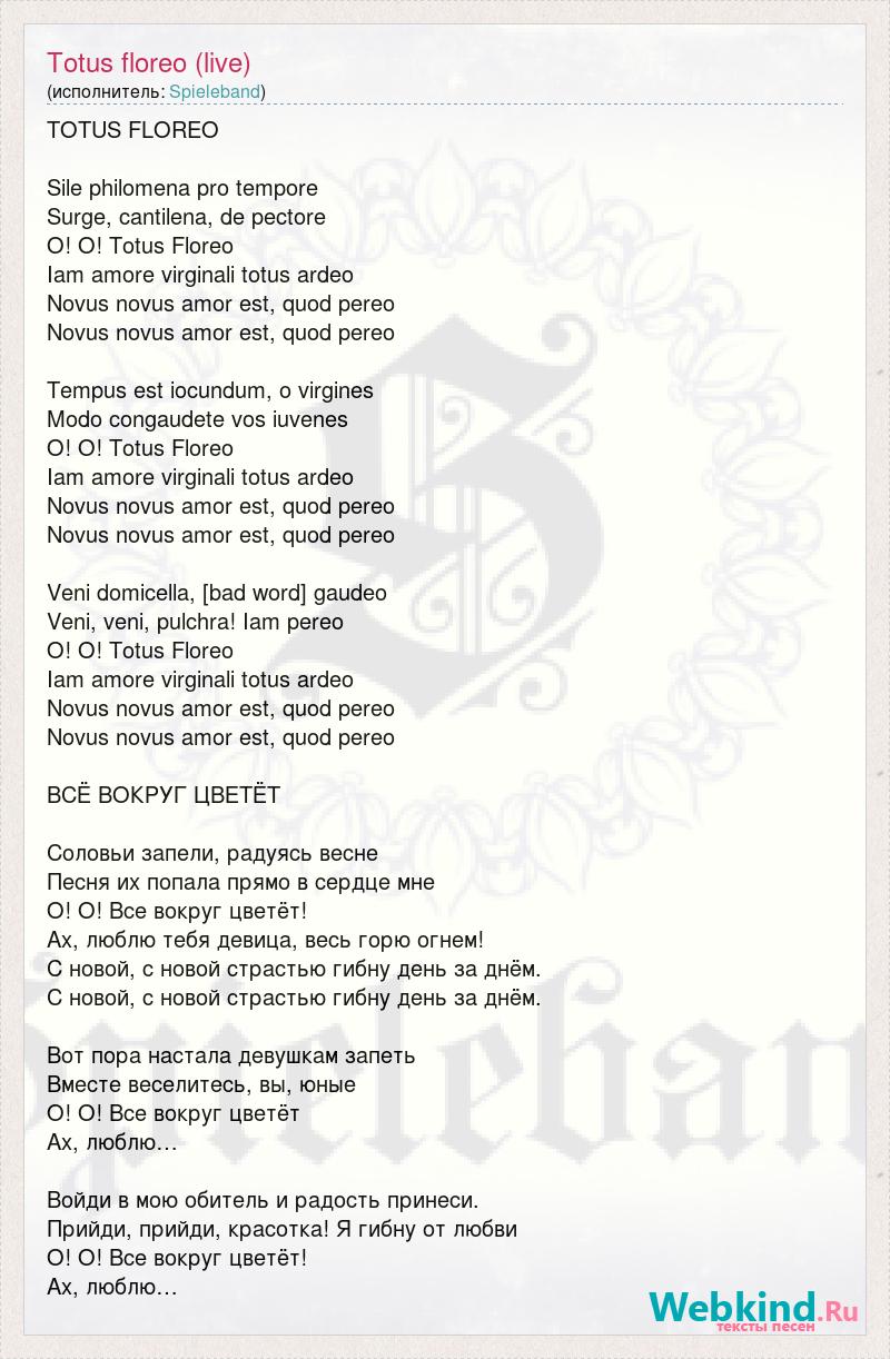 TOTUS FLOREO Sile philomena pro tempore Surge, cantilena, de pectore O! O! Totus Floreo Iam amore virginali totus ardeo Novus novus amor est, quod pereo Novus novus amor est, quod pereo Tempus est iocundum, o virgines Modo congaudete vos iuvenes O! O! Totus Floreo Iam amore virginali totus ardeo Novus novus amor est, quod pereo Novus novus amor est, quod pereo Veni domicella, [bad word] gaudeo Veni, veni, pulchra! Iam pereo O! O! Totus Floreo Iam amore virginali totus ardeo Novus novus amor est, quod pereo Novus novus amor est, quod pereo ВСЁ ВОКРУГ ЦВЕТЁТ Соловьи запели, радуясь весне Песня их попала прямо в сердце мне О! О! Все вокруг цветёт! Ах, люблю тебя девица, весь горю огнем! С новой, с новой страстью гибну день за днём. С новой, с новой страстью гибну день за днём. Вот пора настала девушкам запеть Вместе веселитесь, вы, юные О! О! Все вокруг цветёт Ах, люблю… Войди в мою обитель и радость принеси. Прийди, прийди, красотка! Я гибну от любви О! О! Все вокруг цветёт! Ах, люблю…