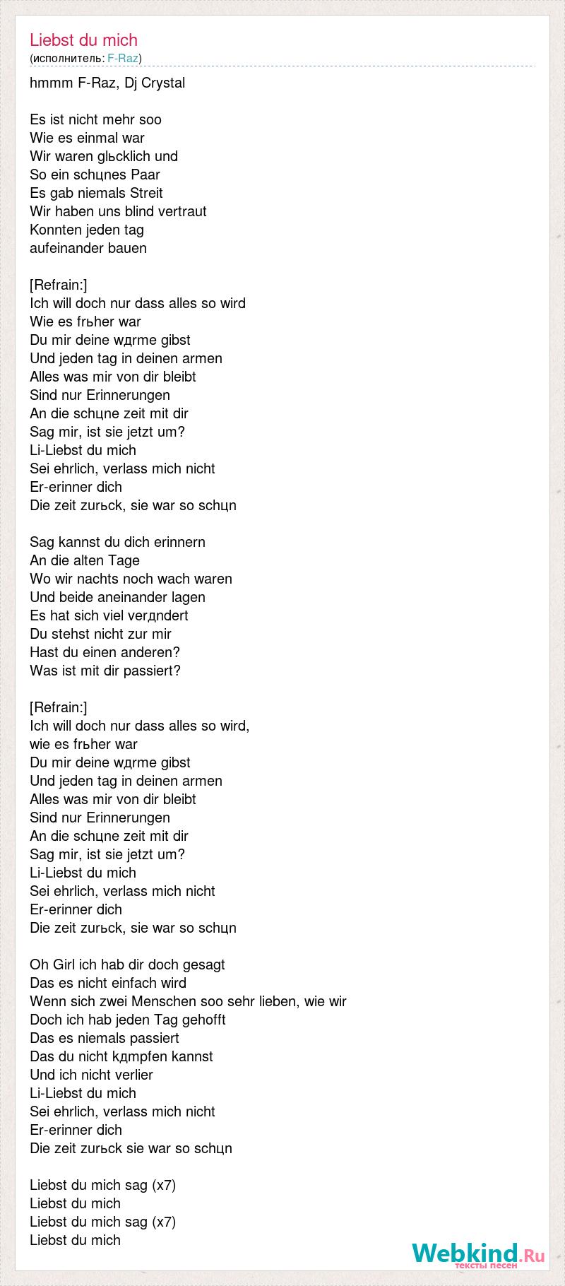 hmmm F-Raz, Dj Crystal Es ist nicht mehr soo Wie es einmal war Wir waren glьcklich und So ein schцnes Paar Es gab niemals Streit Wir haben uns blind vertraut Konnten jeden tag aufeinander bauen [Refrain:] Ich will doch nur dass alles so wird Wie es frьher war Du mir deine wдrme gibst Und jeden tag in deinen armen Alles was mir von dir bleibt Sind nur Erinnerungen An die schцne zeit mit dir Sag mir, ist sie jetzt um? Li-Liebst du mich Sei ehrlich, verlass mich nicht Er-erinner dich Die zeit zurьck, sie war so schцn Sag kannst du dich erinnern An die alten Tage Wo wir nachts noch wach waren Und beide aneinander lagen Es hat sich viel verдndert Du stehst nicht zur mir Hast du einen anderen? Was ist mit dir passiert? [Refrain:] Ich will doch nur dass alles so wird, wie es frьher war Du mir deine wдrme gibst Und jeden tag in deinen armen Alles was mir von dir bleibt Sind nur Erinnerungen An die schцne zeit mit dir Sag mir, ist sie jetzt um? Li-Liebst du mich Sei ehrlich, verlass mich nicht Er-erinner dich Die zeit zurьck, sie war so schцn Oh Girl ich hab dir doch gesagt Das es nicht einfach wird Wenn sich zwei Menschen soo sehr lieben, wie wir Doch ich hab jeden Tag gehofft Das es niemals passiert Das du nicht kдmpfen kannst Und ich nicht verlier Li-Liebst du mich Sei ehrlich, verlass mich nicht Er-erinner dich Die zeit zurьck sie war so schцn Liebst du mich sag (x7) Liebst du mich Liebst du mich sag (x7) Liebst du mich