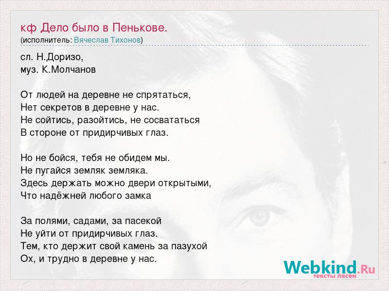 сл. Н.Доризо, муз. К.Молчанов От людей на деревне не спрятаться, Hет секретов в деревне у нас. Hе сойтись, разойтись, не сосвататься В стороне от придирчивых глаз. Hо не бойся, тебя не обидем мы. Hе пугайся земляк земляка. Здесь держать можно двери открытыми, Что надёжней любого замка За полями, садами, за пасекой Не уйти от придирчивых глаз. Тем, кто держит свой камень за пазухой Ох, и трудно в деревне у нас.
