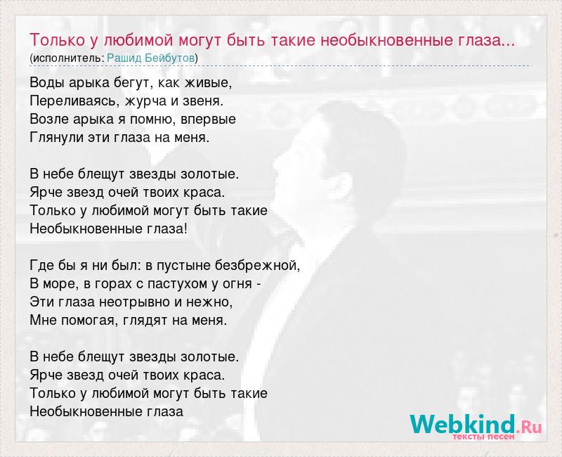 Воды арыка бегут, как живые, Переливаясь, журча и звеня. Возле арыка я помню, впервые Глянули эти глаза на меня. В небе блещут звезды золотые. Ярче звезд очей твоих краса. Только у любимой могут быть такие Необыкновенные глаза! Где бы я ни был: в пустыне безбрежной, В море, в горах с пастухом у огня - Эти глаза неотрывно и нежно, Мне помогая, глядят на меня. В небе блещут звезды золотые. Ярче звезд очей твоих краса. Только у любимой могут быть такие Необыкновенные глаза