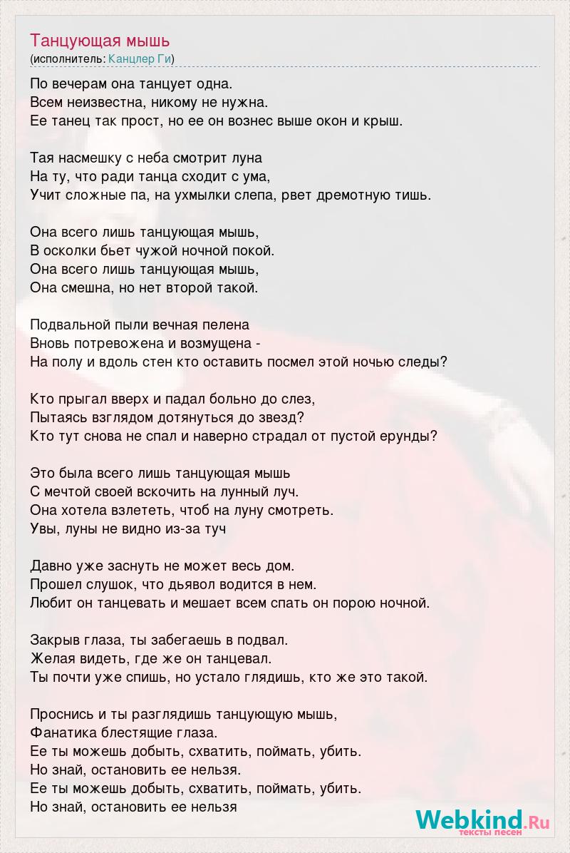 По вечерам она танцует одна. Всем неизвестна, никому не нужна. Ее танец так прост, но ее он вознес выше окон и крыш. Тая насмешку с неба смотрит луна На ту, что ради танца сходит с ума, Учит сложные па, на ухмылки слепа, рвет дремотную тишь. Она всего лишь танцующая мышь, В осколки бьет чужой ночной покой. Она всего лишь танцующая мышь, Она смешна, но нет второй такой. Подвальной пыли вечная пелена Вновь потревожена и возмущена - На полу и вдоль стен кто оставить посмел этой ночью следы? Кто прыгал вверх и падал больно до слез, Пытаясь взглядом дотянуться до звезд? Кто тут снова не спал и наверно страдал от пустой ерунды? Это была всего лишь танцующая мышь С мечтой своей вскочить на лунный луч. Она хотела взлететь, чтоб на луну смотреть. Увы, луны не видно из-за туч Давно уже заснуть не может весь дом. Прошел слушок, что дьявол водится в нем. Любит он танцевать и мешает всем спать он порою ночной. Закрыв глаза, ты забегаешь в подвал. Желая видеть, где же он танцевал. Ты почти уже спишь, но устало глядишь, кто же это такой. Проснись и ты разглядишь танцующую мышь, Фанатика блестящие глаза. Ее ты можешь добыть, схватить, поймать, убить. Но знай, остановить ее нельзя. Ее ты можешь добыть, схватить, поймать, убить. Но знай, остановить ее нельзя