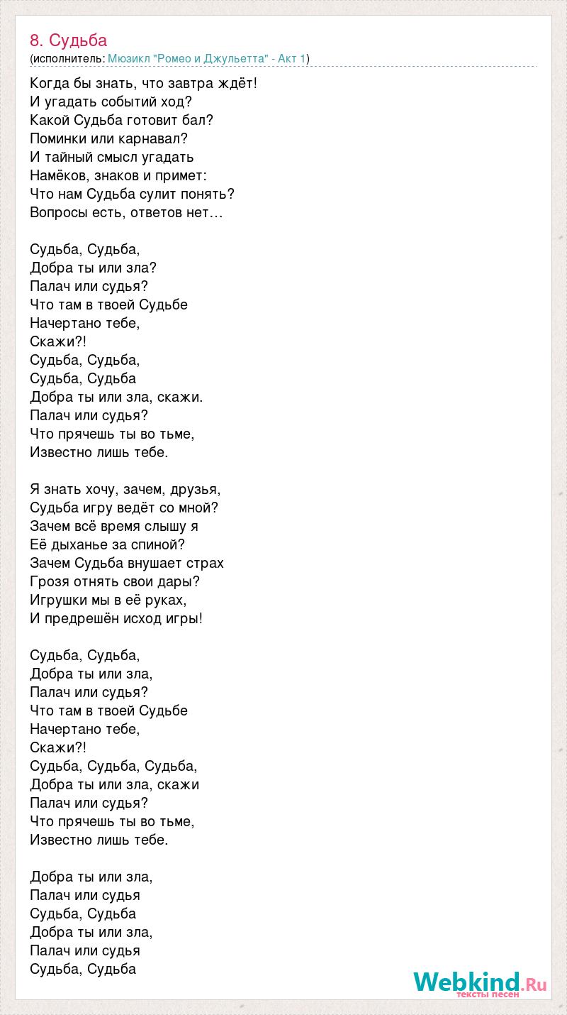 Когда бы знать, что завтра ждёт! И угадать событий ход? Какой Судьба готовит бал? Поминки или карнавал? И тайный смысл угадать Намёков, знаков и примет: Что нам Судьба сулит понять? Вопросы есть, ответов нет… Судьба, Судьба, Добра ты или зла? Палач или судья? Что там в твоей Судьбе Начертано тебе, Скажи?! Судьба, Судьба, Судьба, Судьба Добра ты или зла, скажи. Палач или судья? Что прячешь ты во тьме, Известно лишь тебе. Я знать хочу, зачем, друзья, Судьба игру ведёт со мной? Зачем всё время слышу я Её дыханье за спиной? Зачем Судьба внушает страх Грозя отнять свои дары? Игрушки мы в её руках, И предрешён исход игры! Судьба, Судьба, Добра ты или зла, Палач или судья? Что там в твоей Судьбе Начертано тебе, Скажи?! Судьба, Судьба, Судьба, Добра ты или зла, скажи Палач или судья? Что прячешь ты во тьме, Известно лишь тебе. Добра ты или зла, Палач или судья Судьба, Судьба Добра ты или зла, Палач или судья Судьба, Судьба