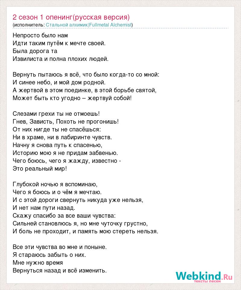 Непросто было нам Идти таким путём к мечте своей. Была дорога та Извилиста и полна плохих людей. Вернуть пытаюсь я всё, что было когда-то со мной: И синее небо, и мой дом родной. А жертвой в этом поединке, в этой борьбе святой, Может быть кто угодно – жертвуй собой! Слезами грехи ты не отмоешь! Гнев, Зависть, Похоть не прогонишь! От них нигде ты не спасёшься: Ни в храме, ни в лабиринте чувств. Начну я снова путь к спасенью, Историю мою я не придам забвенью. Чего боюсь, чего я жажду, известно - Это реальный мир! Глубокой ночью я вспоминаю, Чего я боюсь и о чём я мечтаю. И с этой дороги свернуть никуда уже нельзя, И нет нам пути назад. Скажу спасибо за все ваши чувства: Сильней становлюсь я, но мне чуточку грустно, И боль не проходит, и память мою стереть нельзя. Все эти чувства во мне и поныне. Я стараюсь забыть о них. Мне нужно время Вернуться назад и всё изменить.