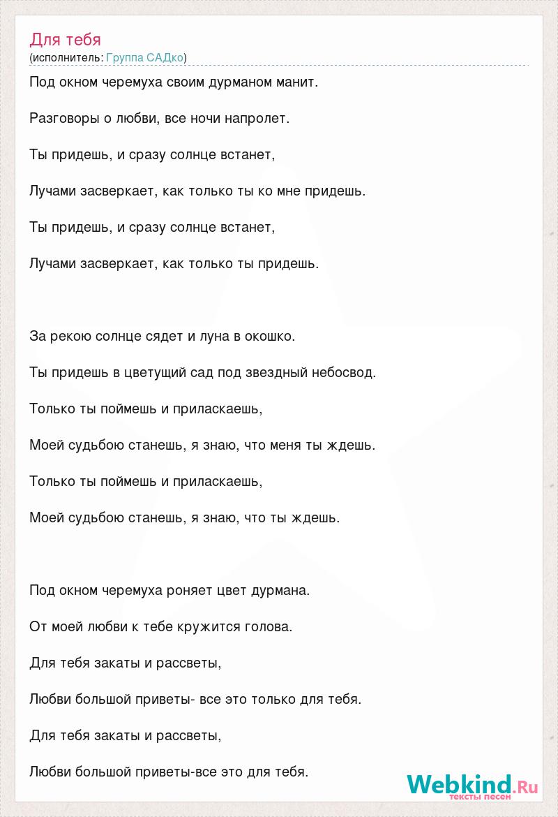 Под окном черемуха своим дурманом манит. Разговоры о любви, все ночи напролет. Ты придешь, и сразу солнце встанет, Лучами засверкает, как только ты ко мне придешь. Ты придешь, и сразу солнце встанет, Лучами засверкает, как только ты придешь. За рекою солнце сядет и луна в окошко. Ты придешь в цветущий сад под звездный небосвод. Только ты поймешь и приласкаешь, Моей судьбою станешь, я знаю, что меня ты ждешь. Только ты поймешь и приласкаешь, Моей судьбою станешь, я знаю, что ты ждешь. Под окном черемуха роняет цвет дурмана. От моей любви к тебе кружится голова. Для тебя закаты и рассветы, Любви большой приветы- все это только для тебя. Для тебя закаты и рассветы, Любви большой приветы-все это для тебя.
