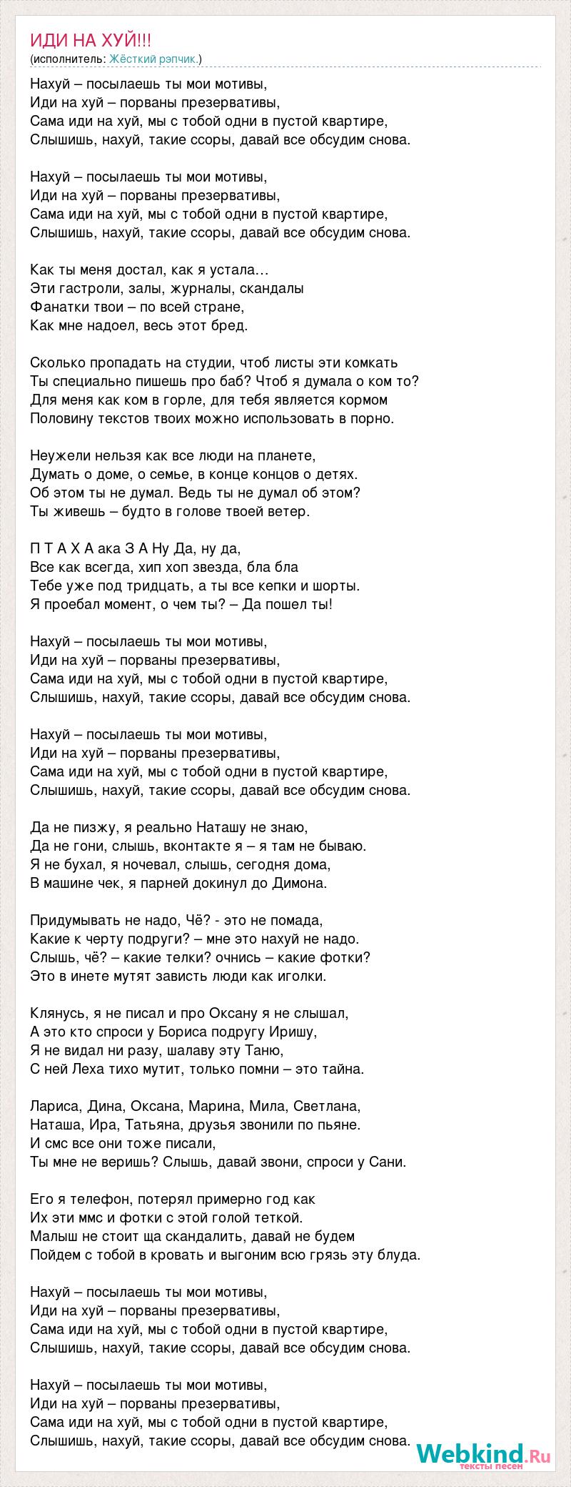 Нахуй – посылаешь ты мои мотивы, Иди на хуй – порваны презервативы, Сама иди на хуй, мы с тобой одни в пустой квартире, Слышишь, нахуй, такие ссоры, давай все обсудим снова. Нахуй – посылаешь ты мои мотивы, Иди на хуй – порваны презервативы, Сама иди на хуй, мы с тобой одни в пустой квартире, Слышишь, нахуй, такие ссоры, давай все обсудим снова. Как ты меня достал, как я устала… Эти гастроли, залы, журналы, скандалы Фанатки твои – по всей стране, Как мне надоел, весь этот бред. Сколько пропадать на студии, чтоб листы эти комкать Ты специально пишешь про баб? Чтоб я думала о ком то? Для меня как ком в горле, для тебя является кормом Половину текстов твоих можно использовать в порно. Неужели нельзя как все люди на планете, Думать о доме, о семье, в конце концов о детях. Об этом ты не думал. Ведь ты не думал об этом? Ты живешь – будто в голове твоей ветер. П Т А Х А ака З А Ну Да, ну да, Все как всегда, хип хоп звезда, бла бла Тебе уже под тридцать, а ты все кепки и шорты. Я проебал момент, о чем ты? – Да пошел ты! Нахуй – посылаешь ты мои мотивы, Иди на хуй – порваны презервативы, Сама иди на хуй, мы с тобой одни в пустой квартире, Слышишь, нахуй, такие ссоры, давай все обсудим снова. Нахуй – посылаешь ты мои мотивы, Иди на хуй – порваны презервативы, Сама иди на хуй, мы с тобой одни в пустой квартире, Слышишь, нахуй, такие ссоры, давай все обсудим снова. Да не пизжу, я реально Наташу не знаю, Да не гони, слышь, вконтакте я – я там не бываю. Я не бухал, я ночевал, слышь, сегодня дома, В машине чек, я парней докинул до Димона. Придумывать не надо, Чё? - это не помада, Какие к черту подруги? – мне это нахуй не надо. Слышь, чё? – какие телки? очнись – какие фотки? Это в инете мутят зависть люди как иголки. Клянусь, я не писал и про Оксану я не слышал, А это кто спроси у Бориса подругу Иришу, Я не видал ни разу, шалаву эту Таню, С ней Леха тихо мутит, только помни – это тайна. Лариса, Дина, Оксана, Марина, Мила, Светлана, Наташа, Ира, Татьяна, друзья звонили по пьяне. И смс все они тоже писали, Ты мне не веришь? Слышь, давай звони, спроси у Сани. Его я телефон, потерял примерно год как Их эти ммс и фотки с этой голой теткой. Малыш не стоит ща скандалить, давай не будем Пойдем с тобой в кровать и выгоним всю грязь эту блуда. Нахуй – посылаешь ты мои мотивы, Иди на хуй – порваны презервативы, Сама иди на хуй, мы с тобой одни в пустой квартире, Слышишь, нахуй, такие ссоры, давай все обсудим снова. Нахуй – посылаешь ты мои мотивы, Иди на хуй – порваны презервативы, Сама иди на хуй, мы с тобой одни в пустой квартире, Слышишь, нахуй, такие ссоры, давай все обсудим снова.