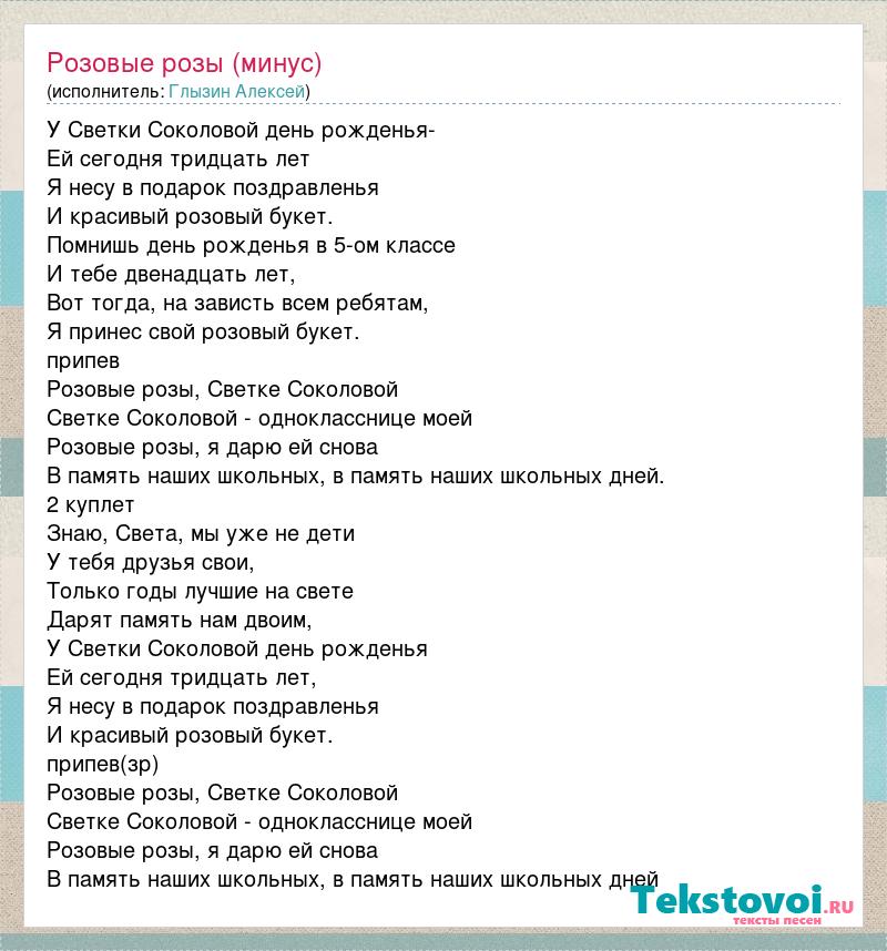 У Светки Соколовой день рожденья- Ей сегодня тридцать лет Я несу в подарок поздравленья И красивый розовый букет. Помнишь день рожденья в 5-ом классе И тебе двенадцать лет, Вот тогда, на зависть всем ребятам, Я принес свой розовый букет. припев Розовые розы, Светке Соколовой Светке Соколовой - однокласснице моей Розовые розы, я дарю ей снова В память наших школьных, в память наших школьных дней. 2 куплет Знаю, Света, мы уже не дети У тебя друзья свои, Только годы лучшие на свете Дарят память нам двоим, У Светки Соколовой день рожденья Ей сегодня тридцать лет, Я несу в подарок поздравленья И красивый розовый букет. припев(зр) Розовые розы, Светке Соколовой Светке Соколовой - однокласснице моей Розовые розы, я дарю ей снова В память наших школьных, в память наших школьных дней