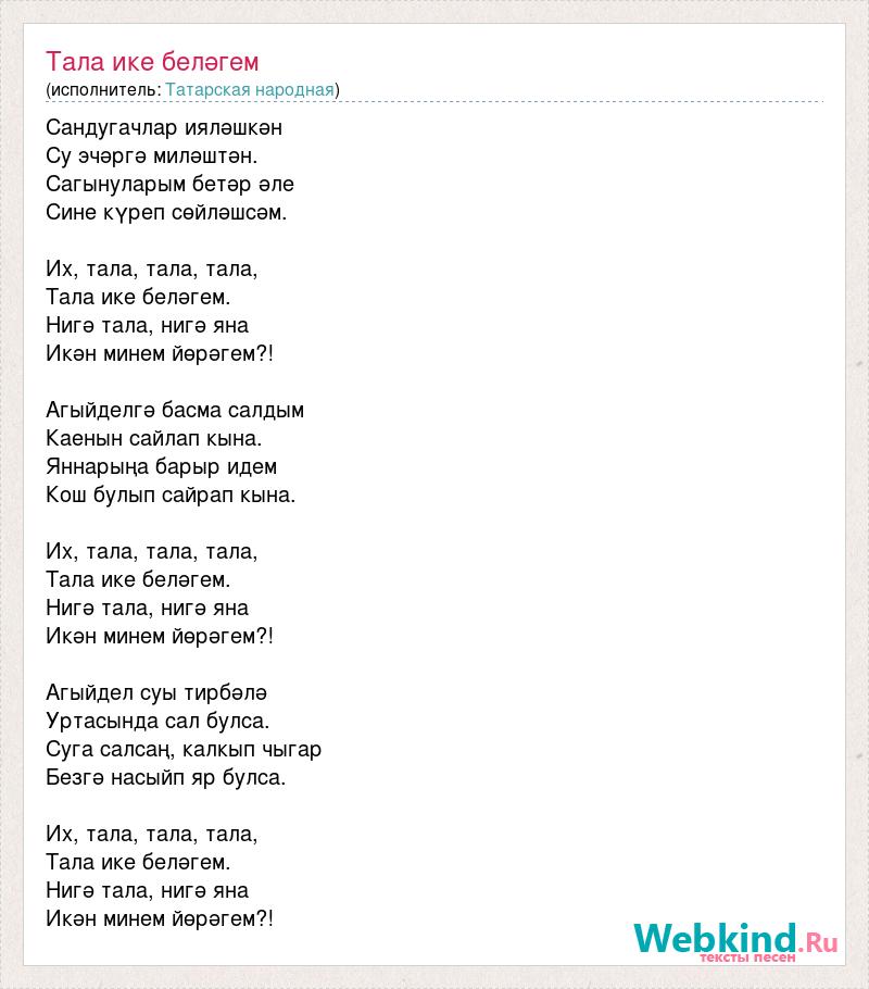 Сандугачлар ияләшкән Су эчәргә миләштән. Сагынуларым бетәр әле Сине күреп сөйләшсәм. Их, тала, тала, тала, Тала ике беләгем. Нигә тала, нигә яна Икән минем йөрәгем?! Агыйделгә басма салдым Каенын сайлап кына. Яннарыңа барыр идем Кош булып сайрап кына. Их, тала, тала, тала, Тала ике беләгем. Нигә тала, нигә яна Икән минем йөрәгем?! Агыйдел суы тирбәлә Уртасында сал булса. Суга салсаң, калкып чыгар Безгә насыйп яр булса. Их, тала, тала, тала, Тала ике беләгем. Нигә тала, нигә яна Икән минем йөрәгем?!
