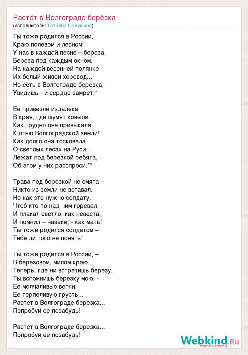 Ты тоже родился в России, Краю полевом и лесном. У нас в каждой песне – береза, Береза под каждым окном. На каждой весенней полянке - Их белый живой хоровод... Но есть в Волгограде березка, – Увидишь - и сердце замрет.* Ее привезли издалека В края, где шумят ковыли. Как трудно она привыкала К огню Волгоградской земли! Как долго она тосковала О светлых лесах на Руси… Лежат под березкой ребята, Об этом у них расспроси.** Трава под березкой не смята – Никто из земли не вставал. Но как это нужно солдату, Чтоб кто-то над ним горевал. И плакал светло, как невеста, И помнил – навеки, - как мать! Ты тоже родился солдатом – Тебе ли того не понять! Ты тоже родился в России, – В березовом, милом краю... Теперь, где ни встретишь березу, Ты вспомнишь березку мою, - Ее молчаливые ветки, Ее терпеливую грусть... Растет в Волгограде березка... Попробуй ее позабудь! Растет в Волгограде березка... Попробуй ее позабудь!