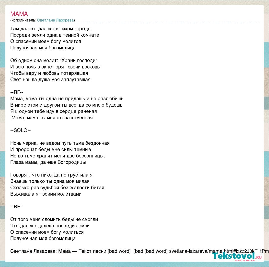 Там далеко-далеко в тихом городе Посреди земли одна в темной комнате О спасении моем богу молится Полуночная моя богомолица Об одном она молит: "Храни господи" И всю ночь в окне горят свечи восковы Чтобы веру и любовь потерявшая Свет нашла душа моя заплутавшая --RF-- Мама, мама ты одна не придашь и не разлюбишь В мире этом и другом ты всегда со мною будешь Я к одной тебе иду в сердце раненая |Мама, мама ты моя стена каменная --SOLO-- Ночь черна, не ведом путь тьма бездонная И пророчат беды мне силы темные Но во тьме хранят меня две бессонницы: Глаза мамы, да еще Богородицы Говорят, что никогда не грустила я Знаешь только ты одна моя милая Сколько раз судьбой без жалости битая Выживала я твоими молитвами --RF-- От того меня сломить беды не смогли Что далеко-далеко посреди земли О спасении моем богу молиться Полуночная моя богомолица Светлана Лазарева: Мама — Текст песни [bad word] [bad word] ru/svetlana-lazareva/mama.html#ixzz2J0kT1tPm