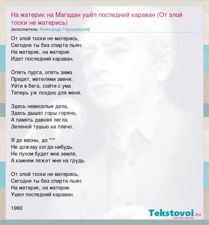 От злой тоски не матерись, Сегодня ты без спирта пьян: На материк, на материк Идет последний караван. Опять пурга, опять зима Придет, метелями звеня; Уйти в бега, сойти с ума Теперь уж поздно для меня. Здесь невеселые дела, Здесь дышат горы горячо, А память давняя легла Зеленой тушью на плечо. Я до весны, до *** Не доживу когда-нибудь. Не пухом будет мне земля, А камнем ляжет мне на грудь. От злой тоски не матерись, Сегодня ты без спирта пьян: На материк, на материк Ушел последний караван. 1960