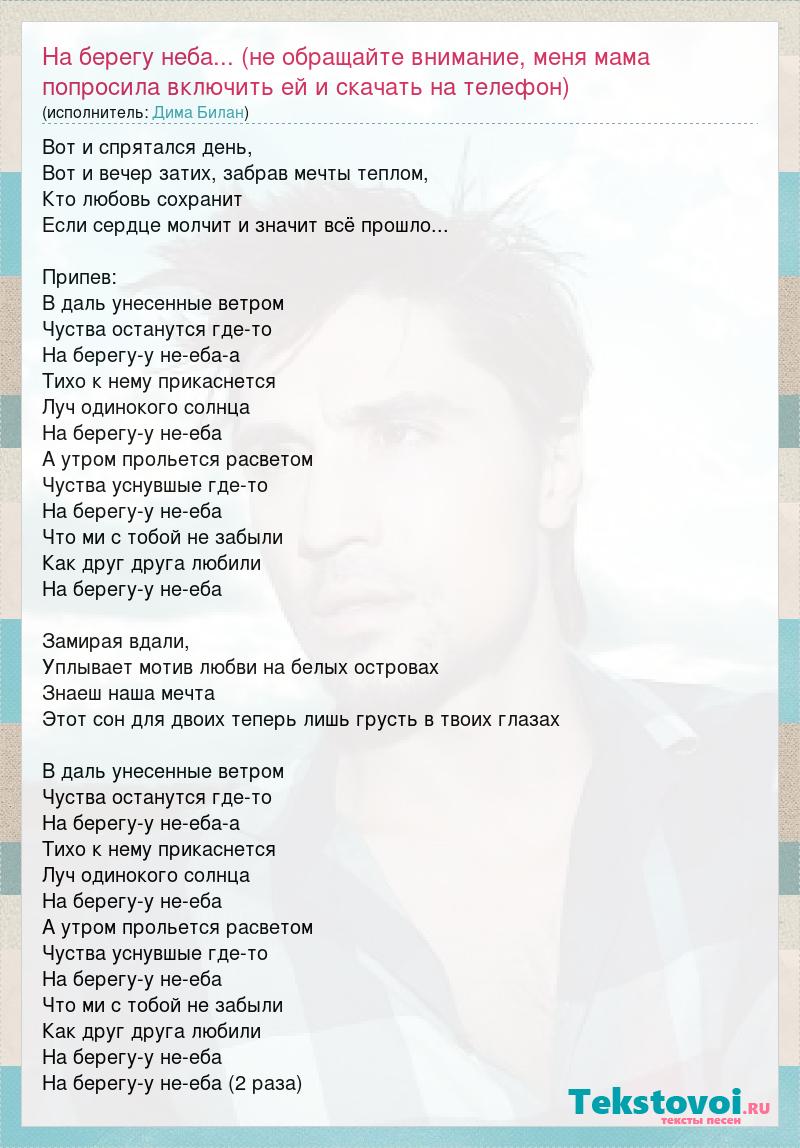 Вот и спрятался день, Вот и вечер затих, забрав мечты теплом, Кто любовь сохранит Если сердце молчит и значит всё прошло... Припев: В даль унесенные ветром Чуства останутся где-то На берегу-у не-еба-а Тихо к нему прикаснется Луч одинокого солнца На берегу-у не-еба А утром прольется расветом Чуства уснувшые где-то На берегу-у не-еба Что ми с тобой не забыли Как друг друга любили На берегу-у не-еба Замирая вдали, Уплывает мотив любви на белых островах Знаеш наша мечта Этот сон для двоих теперь лишь грусть в твоих глазах В даль унесенные ветром Чуства останутся где-то На берегу-у не-еба-а Тихо к нему прикаснется Луч одинокого солнца На берегу-у не-еба А утром прольется расветом Чуства уснувшые где-то На берегу-у не-еба Что ми с тобой не забыли Как друг друга любили На берегу-у не-еба На берегу-у не-еба (2 раза)