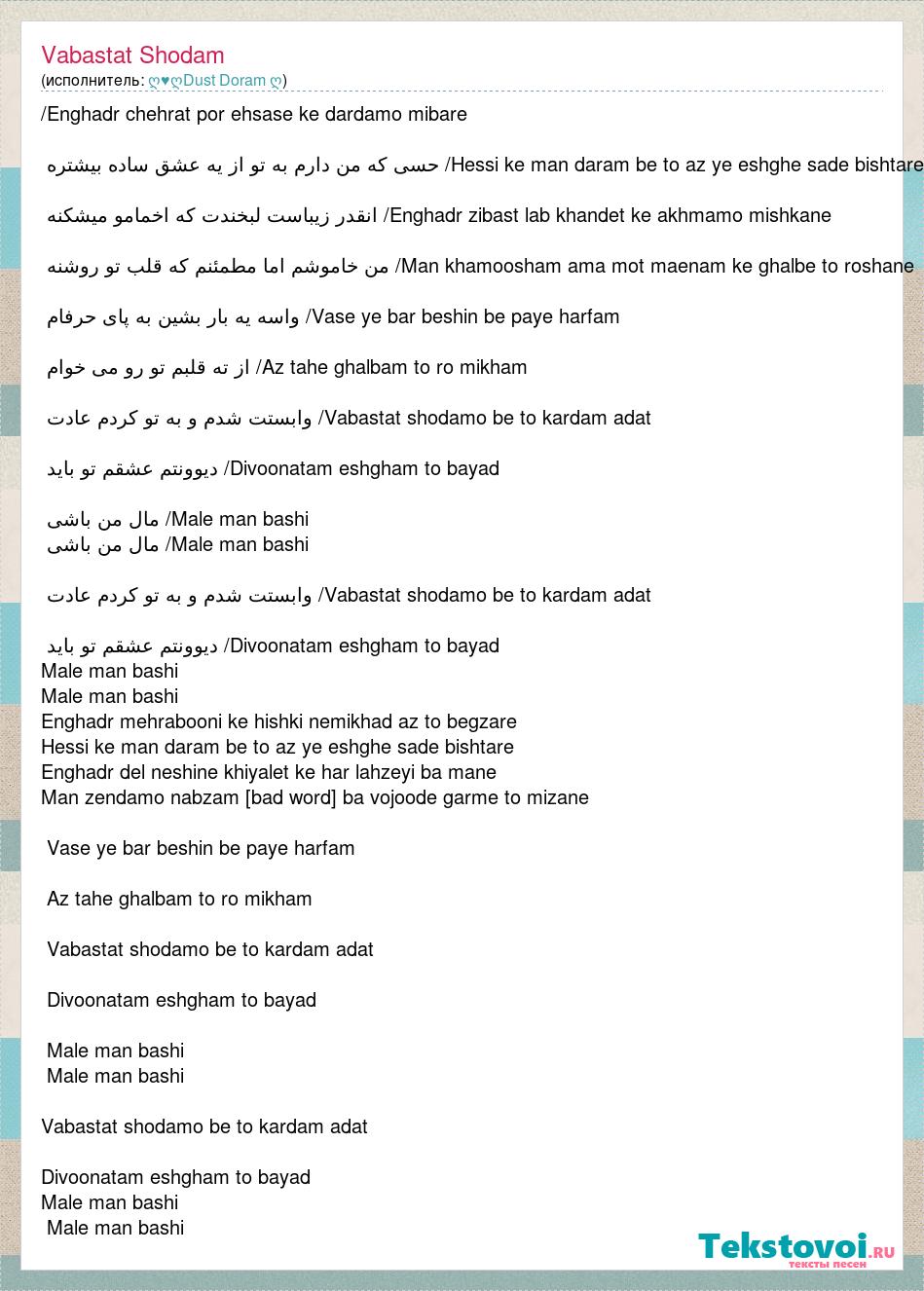 /Enghadr chehrat por ehsase ke dardamo mibare حسی که من دارم به تو از یه عشق ساده بیشتره /Hessi ke man daram be to az ye eshghe sade bishtare انقدر زیباست لبخندت که اخمامو میشکنه /Enghadr zibast lab khandet ke akhmamo mishkane من خاموشم اما مطمئنم که قلب تو روشنه /Man khamoosham ama mot maenam ke ghalbe to roshane واسه یه بار بشین به پای حرفام /Vase ye bar beshin be paye harfam از ته قلبم تو رو می خوام /Az tahe ghalbam to ro mikham وابستت شدم و به تو کردم عادت /Vabastat shodamo be to kardam adat دیوونتم عشقم تو باید /Divoonatam eshgham to bayad مال من باشی /Male man bashi مال من باشی /Male man bashi وابستت شدم و به تو کردم عادت /Vabastat shodamo be to kardam adat دیوونتم عشقم تو باید /Divoonatam eshgham to bayad Male man bashi Male man bashi Enghadr mehrabooni ke hishki nemikhad az to begzare Hessi ke man daram be to az ye eshghe sade bishtare Enghadr del neshine khiyalet ke har lahzeyi ba mane Man zendamo nabzam [bad word] ba vojoode garme to mizane Vase ye bar beshin be paye harfam Az tahe ghalbam to ro mikham Vabastat shodamo be to kardam adat Divoonatam eshgham to bayad Male man bashi Male man bashi Vabastat shodamo be to kardam adat Divoonatam eshgham to bayad Male man bashi Male man bashi