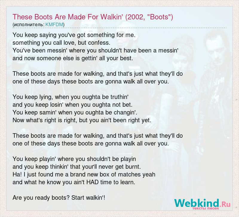 You keep saying you've got something for me. something you call love, but confess. You've been messin' where you shouldn't have been a messin' and now someone else is gettin' all your best. These boots are made for walking, and that's just what they'll do one of these days these boots are gonna walk all over you. You keep lying, when you oughta be truthin' and you keep losin' when you oughta not bet. You keep samin' when you oughta be changin'. Now what's right is right, but you ain't been right yet. These boots are made for walking, and that's just what they'll do one of these days these boots are gonna walk all over you. You keep playin' where you shouldn't be playin and you keep thinkin' that youґll never get burnt. Ha! I just found me a brand new box of matches yeah and what he know you ain't HAD time to learn. Are you ready boots? Start walkin'!