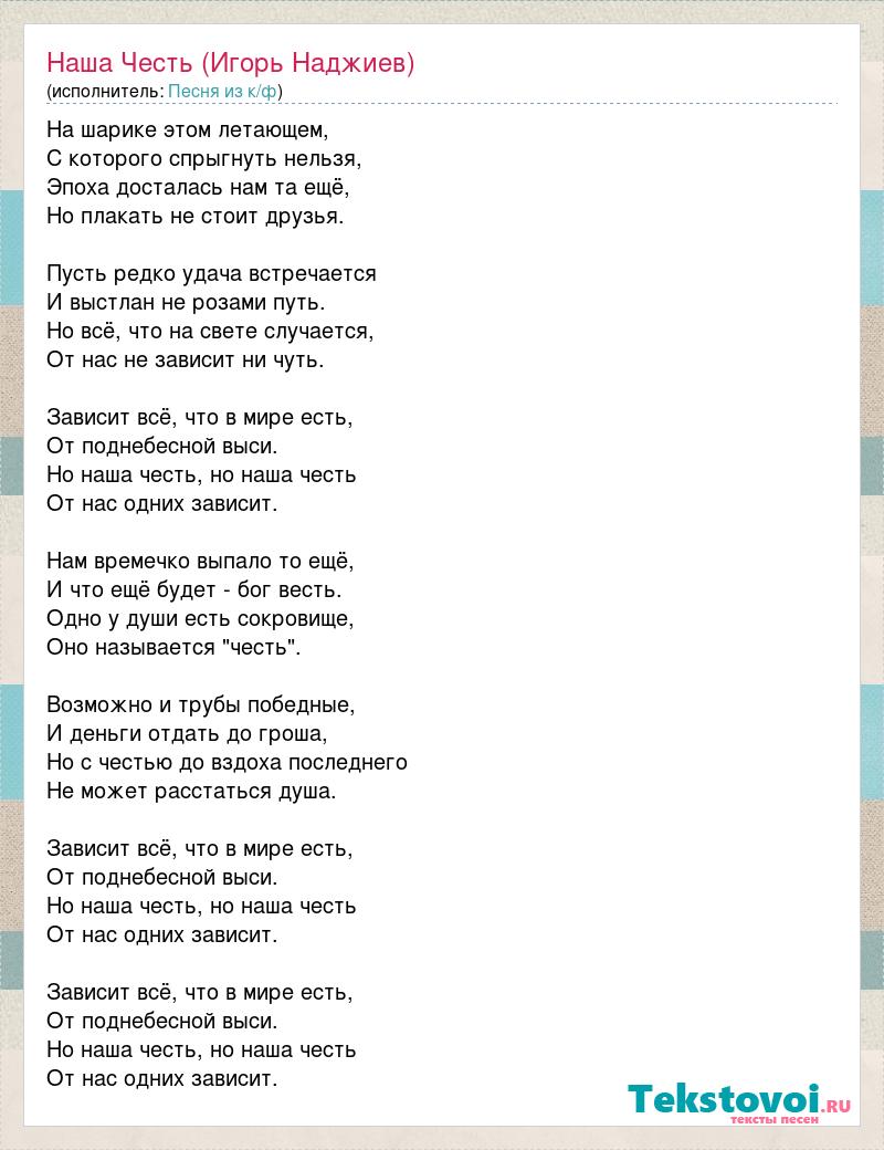 На шарике этом летающем, С которого спрыгнуть нельзя, Эпоха досталась нам та ещё, Но плакать не стоит друзья. Пусть редко удача встречается И выстлан не розами путь. Но всё, что на свете случается, От нас не зависит ни чуть. Зависит всё, что в мире есть, От поднебесной выси. Но наша честь, но наша честь От нас одних зависит. Нам времечко выпало то ещё, И что ещё будет - бог весть. Одно у души есть сокровище, Оно называется "честь". Возможно и трубы победные, И деньги отдать до гроша, Но с честью до вздоха последнего Не может расcтаться душа. Зависит всё, что в мире есть, От поднебесной выси. Но наша честь, но наша честь От нас одних зависит. Зависит всё, что в мире есть, От поднебесной выси. Но наша честь, но наша честь От нас одних зависит.