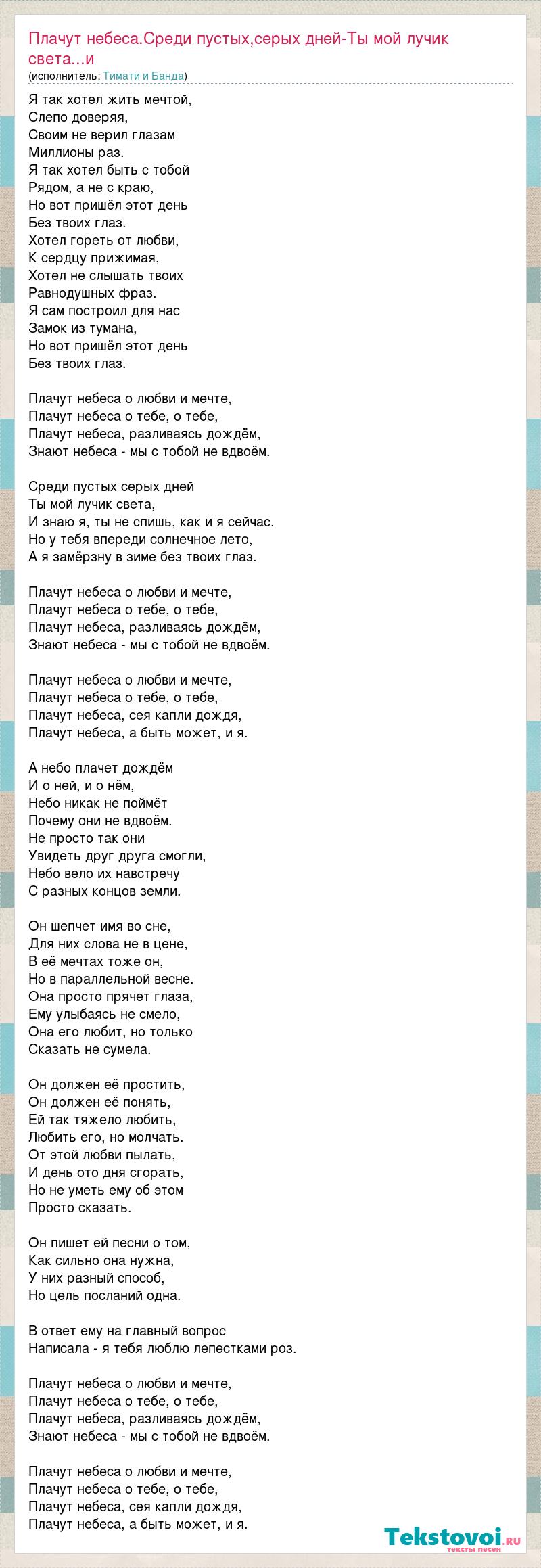 Главная→Исполнители→Тимати и Банда→Плачут небеса.Среди пустых,серых дней-Ты мой лучик света...и знаю я ты не