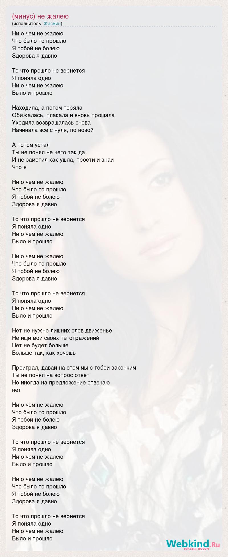 Ни о чем не жалею Что было то прошло Я тобой не болею Здорова я давно То что прошло не вернется Я поняла одно Ни о чем не жалею Было и прошло Находила, а потом теряла Обижалась, плакала и вновь прощала Уходила возвращалась снова Начинала все с нуля, по новой А потом устал Ты не понял не чего так да И не заметил как ушла, прости и знай Что я Ни о чем не жалею Что было то прошло Я тобой не болею Здорова я давно То что прошло не вернется Я поняла одно Ни о чем не жалею Было и прошло Ни о чем не жалею Что было то прошло Я тобой не болею Здорова я давно То что прошло не вернется Я поняла одно Ни о чем не жалею Было и прошло Нет не нужно лишних слов движенье Не ищи мои своих ты отражений Нет не будет больше Больше так, как хочешь Проиграл, давай на этом мы с тобой закончим Ты не понял на вопрос ответ Но иногда на предложение отвечаю нет Ни о чем не жалею Что было то прошло Я тобой не болею Здорова я давно То что прошло не вернется Я поняла одно Ни о чем не жалею Было и прошло Ни о чем не жалею Что было то прошло Я тобой не болею Здорова я давно То что прошло не вернется Я поняла одно Ни о чем не жалею Было и прошло