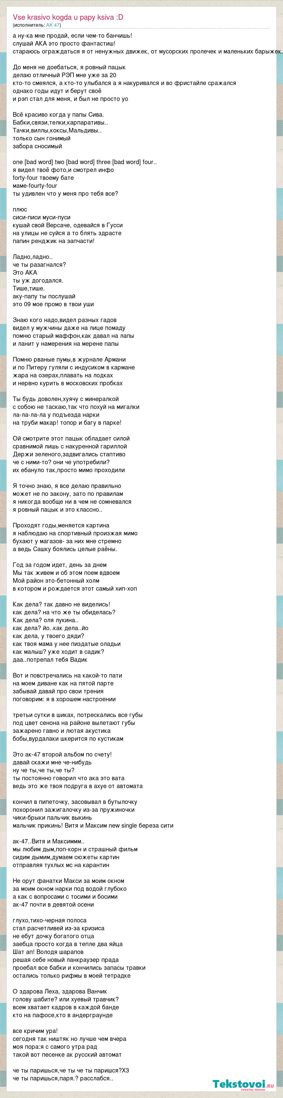 а ну-ка мне продай, если чем-то банчишь! слушай АКА это просто фантастиш! стараюсь ограждаться я от ненужных движек, от мусорских пролечек и маленьких барыжек. До меня не доебаться, я ровный пацык делаю отличный РЭП мне уже за 20 кто-то смеялся, а кто-то улыбался а я накуривался и во фристайле сражался однако годы идут и берут своё и рэп стал для меня, и был не просто yo Всё красиво когда у папы Сива. Бабки,связи,телки,карпаративы.. Тачки,виллы,коксы,Мальдивы.. только сын гонимый забора сносимый one [bad word] two [bad word] three [bad word] four.. я видел твоё фото,и смотрел инфо forty-four твоему бате маме-fourty-four ты удивлен что у меня про тебя все? плюс сиси-писи муси-пуси кушай свой Версаче, одевайся в Гусси на улицы не суйся а то блять здрасте папин ренджик на запчасти! Ладно,ладно.. че ты разагнался? Это АКА ты уж догодался. Тише,тише. аку-папу ты послушай это 09 мое промо в твои уши Знаю кого надо,видел разных гадов видел у мужчины даже на лице помаду помню старый маффон,как давал на лапы и ланит у намерения на мерене папы Помню рваные пумы,в журнале Армани и по Питеру гуляли с индусиком в кармане жара на озерах,плавать на лодках и нервно курить в московских пробках Ты будь доволен,хуячу с минералкой с собою не таскаю,так что похуй на мигалки ла-ла-ла-ла у подъезда нарки на труби макар! топор и багу в парке! Ой смотрите этот пацык обладает силой сравнимой лишь с накуренной гариллой Держи зеленого,задвигались стаптиво че с ними-то? они че употребили? их ебануло так,просто мимо проходили Я точно знаю, я все делаю правильно может не по закону, зато по правилам я никогда вообще ни в чем не сомневался я ровный пацык и это классно.. Проходят годы,меняется картина я наблюдаю на спортивный произжая мимо бухают у магазов- за них мне стремно а ведь Сашку боялись целые раёны. Год за годом идет, день за днем Мы так живем и об этом поем вдвоем Мой район это-бетонный холм в котором и рождается этот самый хип-хоп Как дела? так давно не виделись! как дела? на что же ты обиделась? Как дела? оля лукина.. как дела? йо..как дела..йо как дела, у твоего дяди? как твоя мама у нее пиздатые оладьи как малыш? уже ходит в садик? даа..потрепал тебя Вадик Вот и повстречались на какой-то пати на моем диване как на пятой парте забывай давай про свои трения поговорим: я в хорошем настроении третьи сутки в шиках, потрескались все губы под цвет сенона на районе вылетают губы зажарено гавно и лютая акустика бобы,вурдалаки шкерится по кустикам Это ак-47 второй альбом по счету! давай скажи мне че-нибудь ну че ты,че ты,че ты? ты постоянно говорил что ака это вата ведь это же твоя подруга в ахуе от автомата кончил в пипеточку, засовывал в бутылочку похоронил зажигалочку из-за пружиночки чики-брыки пальчик выкинь мальчик прикинь! Витя и Максим new single береза сити ак-47..Витя и Максиммм.. мы любим дым,поп-корн и страшный фильм сидим дымим,думаем сюжеты картин отправляя тухлых мс на карантин Не орут фанатки Макси за моим окном за моим окном нарки под водой глубоко а как с вопросами с тосими и босими ак-47 почти в девятой осени глухо,тихо-черная полоса стал расчетливей из-за кризиса не ебут дочку богатого отца заебца просто когда в тепле два яйца Шат ап! Володя шарапов решая себе новый ланкраузер прада проебал все бабки и кончились запасы травки остались только рифмы в моей тетрадке О здарова Леха, здарова Ванчик голову шабите? или хуевый травч