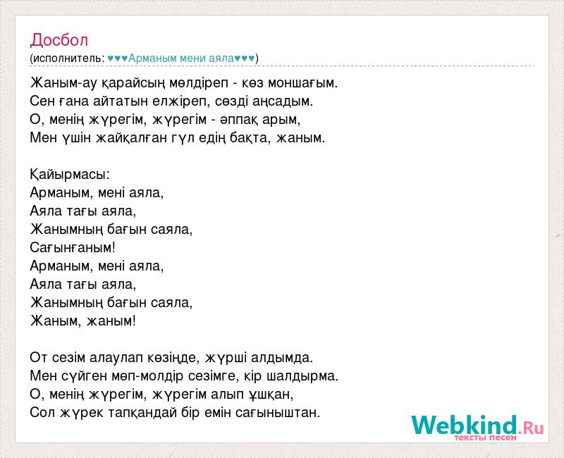 Жаным-ау қарайсың мөлдіреп - көз моншағым. Сен ғана айтатын елжіреп, сөзді аңсадым. О, менің жүрегім, жүрегім - әппақ арым, Мен үшін жайқалған гүл едің бақта, жаным. Қайырмасы: Арманым, мені аяла, Аяла тағы аяла, Жанымның бағын саяла, Сағынғаным! Арманым, мені аяла, Аяла тағы аяла, Жанымның бағын саяла, Жаным, жаным! От сезім алаулап көзіңде, жүрші алдымда. Мен сүйген мөп-молдір сезімге, кір шалдырма. О, менің жүрегім, жүрегім алып ұшқан, Сол жүрек тапқандай бір емін сағыныштан.