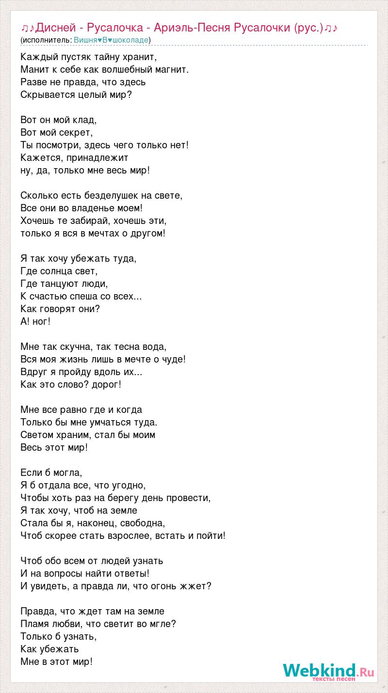 Каждый пустяк тайну хранит, Манит к себе как волшебный магнит. Разве не правда, что здесь Скрывается целый мир? Вот он мой клад, Вот мой секрет, Ты посмотри, здесь чего только нет! Кажется, принадлежит ну, да, только мне весь мир! Сколько есть безделушек на свете, Все они во владенье моем! Хочешь те забирай, хочешь эти, только я вся в мечтах о другом! Я так хочу убежать туда, Где солнца свет, Где танцуют люди, К счастью спеша со всех... Как говорят они? А! ног! Мне так скучна, так тесна вода, Вся моя жизнь лишь в мечте о чуде! Вдруг я пройду вдоль их... Как это слово? дорог! Мне все равно где и когда Только бы мне умчаться туда. Светом храним, стал бы моим Весь этот мир! Если б могла, Я б отдала все, что угодно, Чтобы хоть раз на берегу день провести, Я так хочу, чтоб на земле Стала бы я, наконец, свободна, Чтоб скорее стать взрослее, встать и пойти! Чтоб обо всем от людей узнать И на вопросы найти ответы! И увидеть, а правда ли, что огонь жжет? Правда, что ждет там на земле Пламя любви, что светит во мгле? Только б узнать, Как убежать Мне в этот мир!