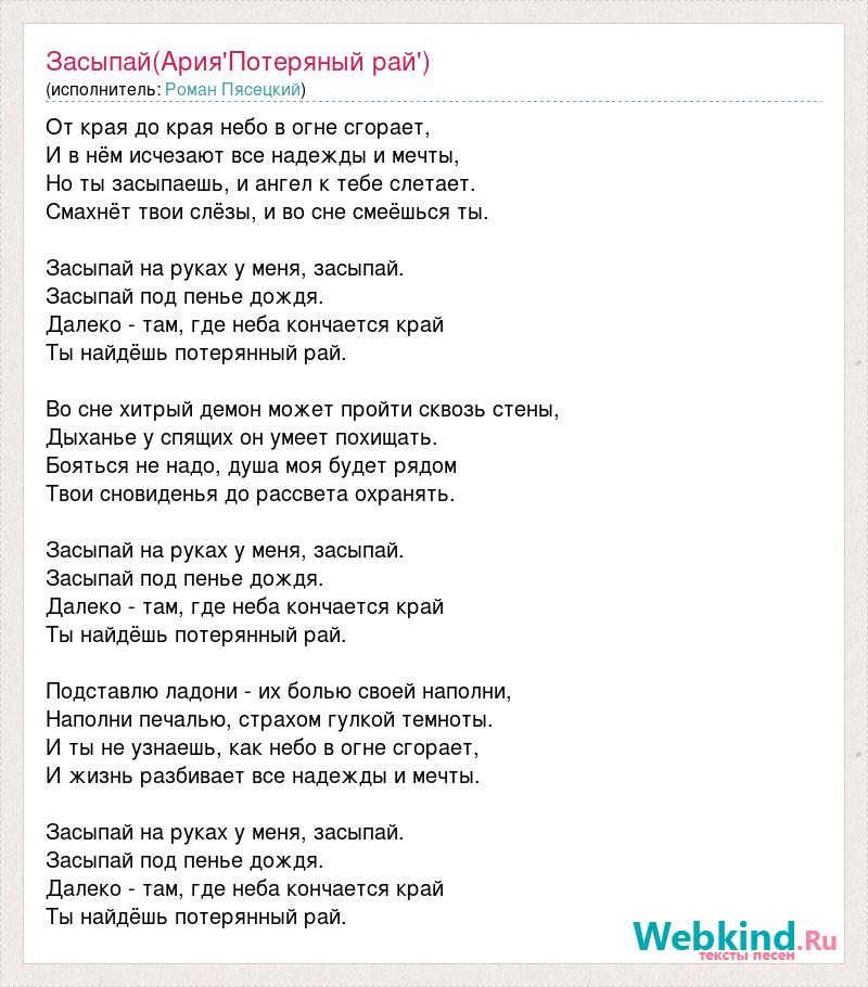 От края до края небо в огне сгорает, И в нём исчезают все надежды и мечты, Но ты засыпаешь, и ангел к тебе слетает. Смахнёт твои слёзы, и во сне смеёшься ты. Засыпай на руках у меня, засыпай. Засыпай под пенье дождя. Далеко - там, где неба кончается край Ты найдёшь потерянный рай. Во сне хитрый демон может пройти сквозь стены, Дыханье у спящих он умеет похищать. Бояться не надо, душа моя будет рядом Твои сновиденья до рассвета охранять. Засыпай на руках у меня, засыпай. Засыпай под пенье дождя. Далеко - там, где неба кончается край Ты найдёшь потерянный рай. Подставлю ладони - их болью своей наполни, Наполни печалью, страхом гулкой темноты. И ты не узнаешь, как небо в огне сгорает, И жизнь разбивает все надежды и мечты. Засыпай на руках у меня, засыпай. Засыпай под пенье дождя. Далеко - там, где неба кончается край Ты найдёшь потерянный рай.